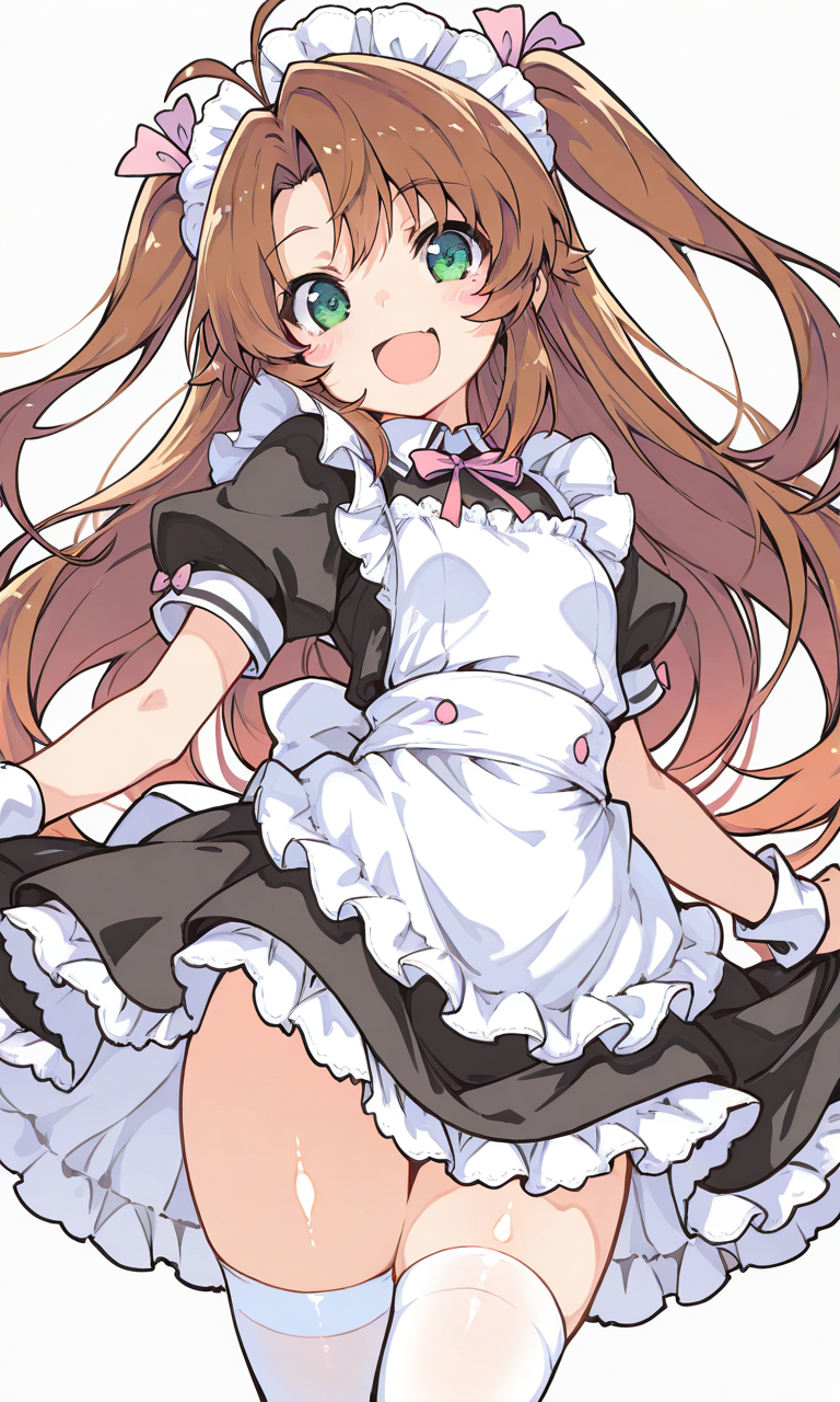 PixAI【Shiitake-Mix】koshigaya komari, maid,short sleeves, white thighhighs, smile,open mouth, cowboy shot,simplebackground,white background, masterpiece,high quality, ,shiny skin, shiny,tokiame,pastel colors, stickers, stylized