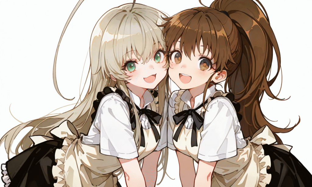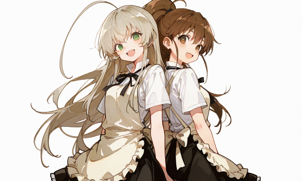 PixAI【Shiitake-Mix】2girls,taneshima popura(WORKING!!),nyarlathotep (nyaruko-san),smile,open mouth, cowboy shot, wagnaria uniform,back-to-back, looking at viewer, simplebackground,white background, masterpiece,high quality,tokiame,748cmstyle,john kafka