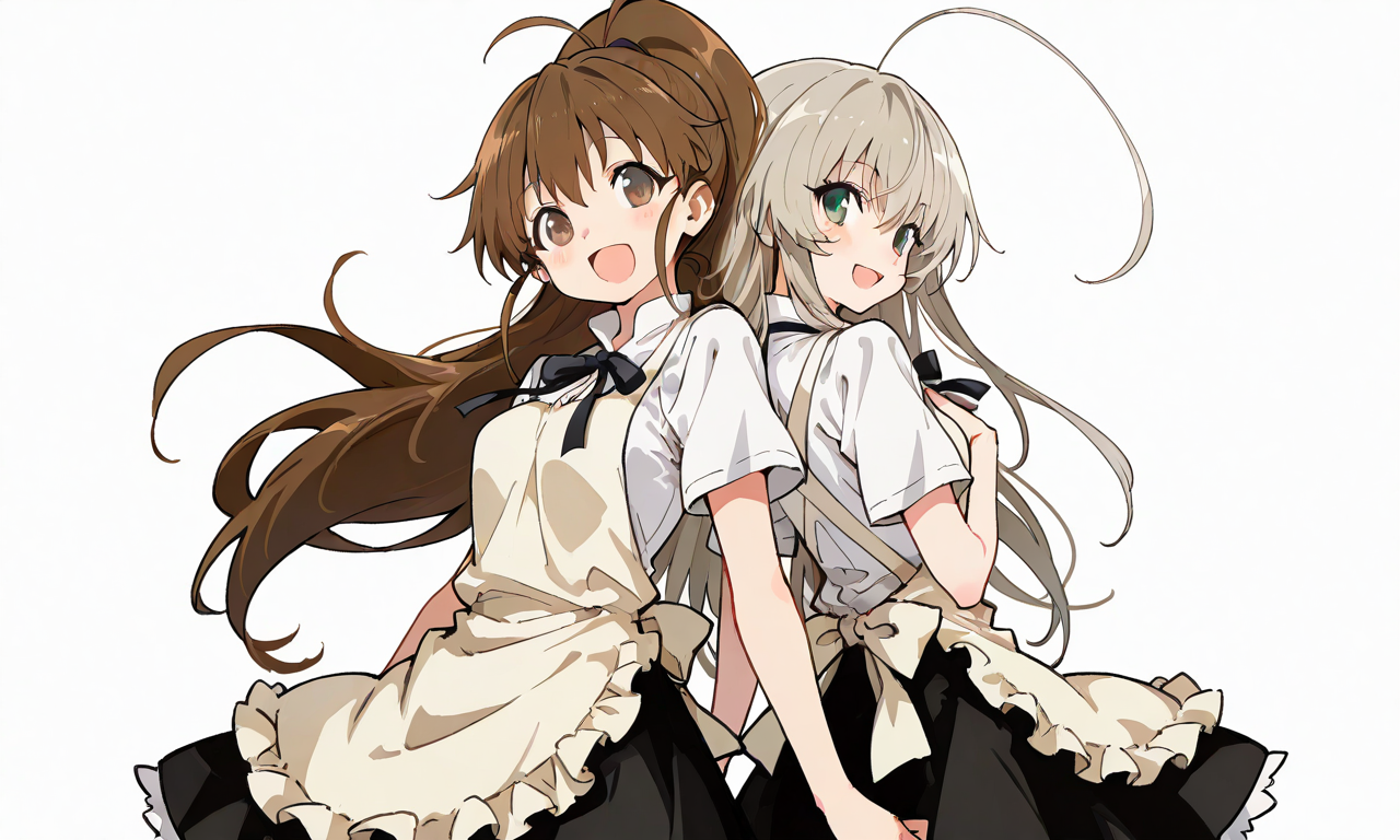 2girls,taneshima popura(WORKING!!),nyarlathotep (nyaruko-san),smile,open mouth, cowboy shot, wagnaria uniform,back-to-back, simplebackground,white background, masterpiece,high quality,tokiame,748cmstyle