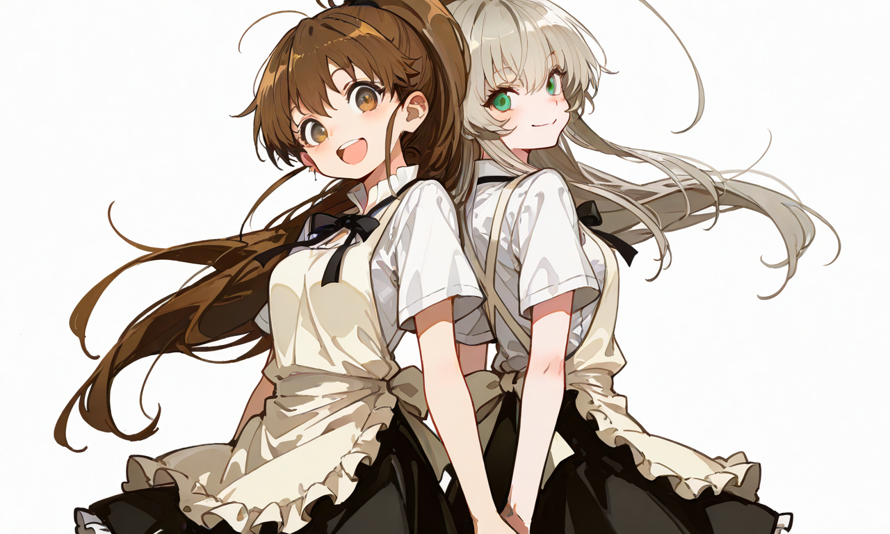 PixAI【Shiitake-Mix】2girls,taneshima popura(WORKING!!),nyarlathotep (nyaruko-san),smile,open mouth, cowboy shot, wagnaria uniform,back-to-back, looking at viewer, simplebackground,white background, masterpiece,high quality,tokiame,748cmstyle,john kafka