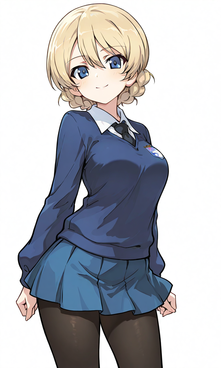 darjeeling (girls und panzer), st. gloriana’s school uniform,pantyhose, smile,cowboy shot,simplebackground,white background, masterpiece,high quality, ,tokiame