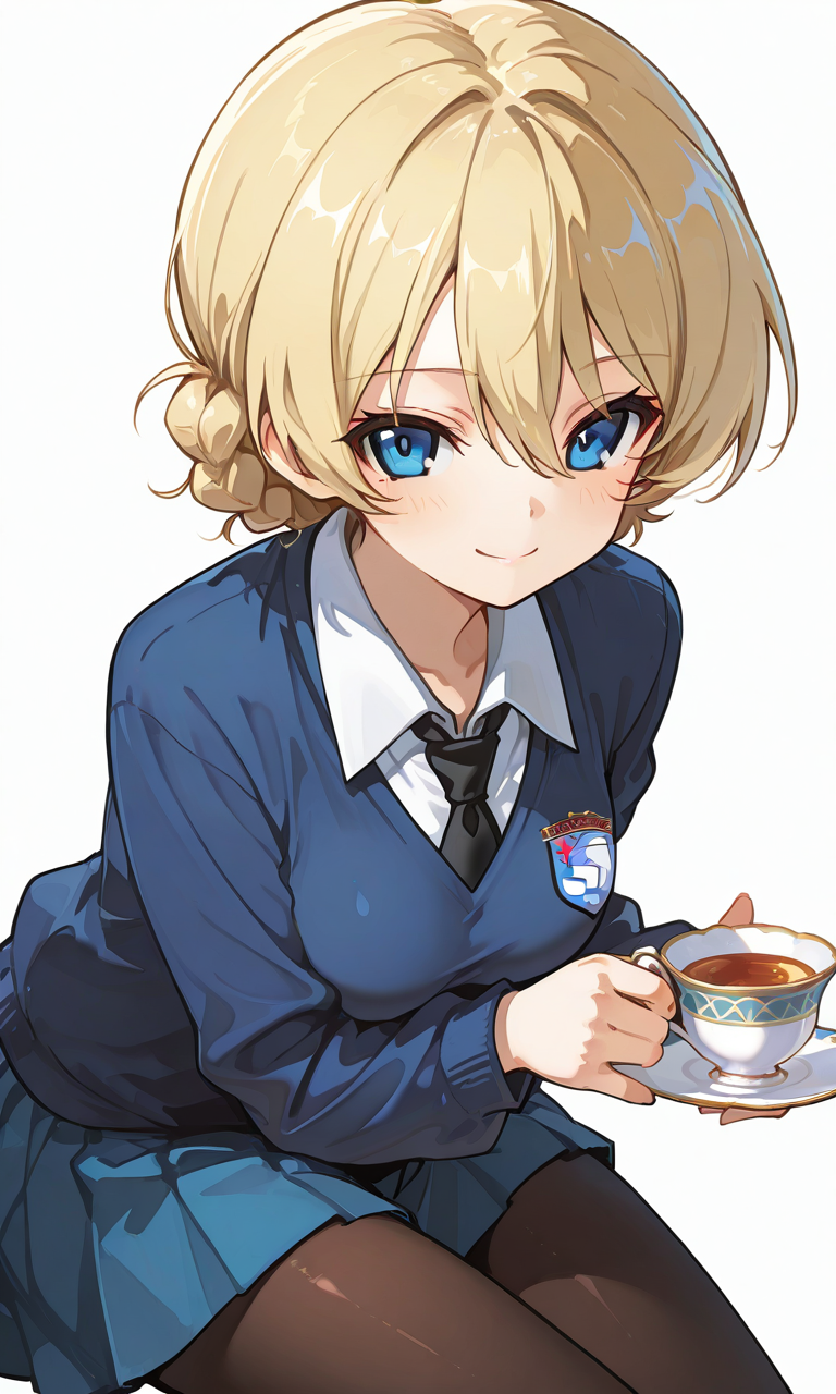 darjeeling (girls und panzer), st. gloriana’s school uniform,pantyhose, smile,teacup, saucer,cowboy shot,simplebackground,white background, masterpiece,high quality, ,tokiame,hyper-detailed, high contrast, depth of field, ray tracing, best lighting, cinematic composition, beautiful face, beautiful eyes, sharp focus, (masterpiece:1.2), (best quality:1.2), (very aesthetic:1.2), (absurdres:1.2), (detailed background),NineV