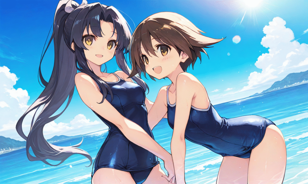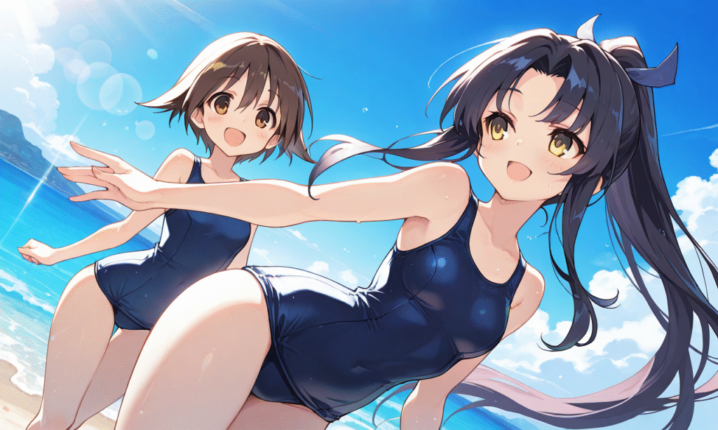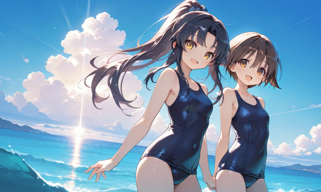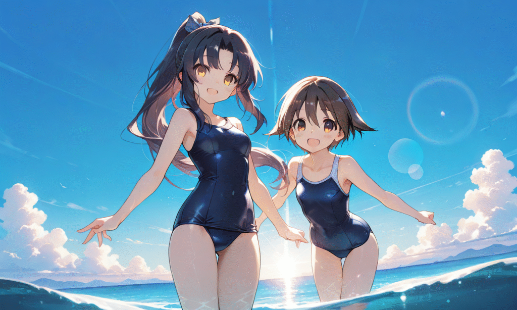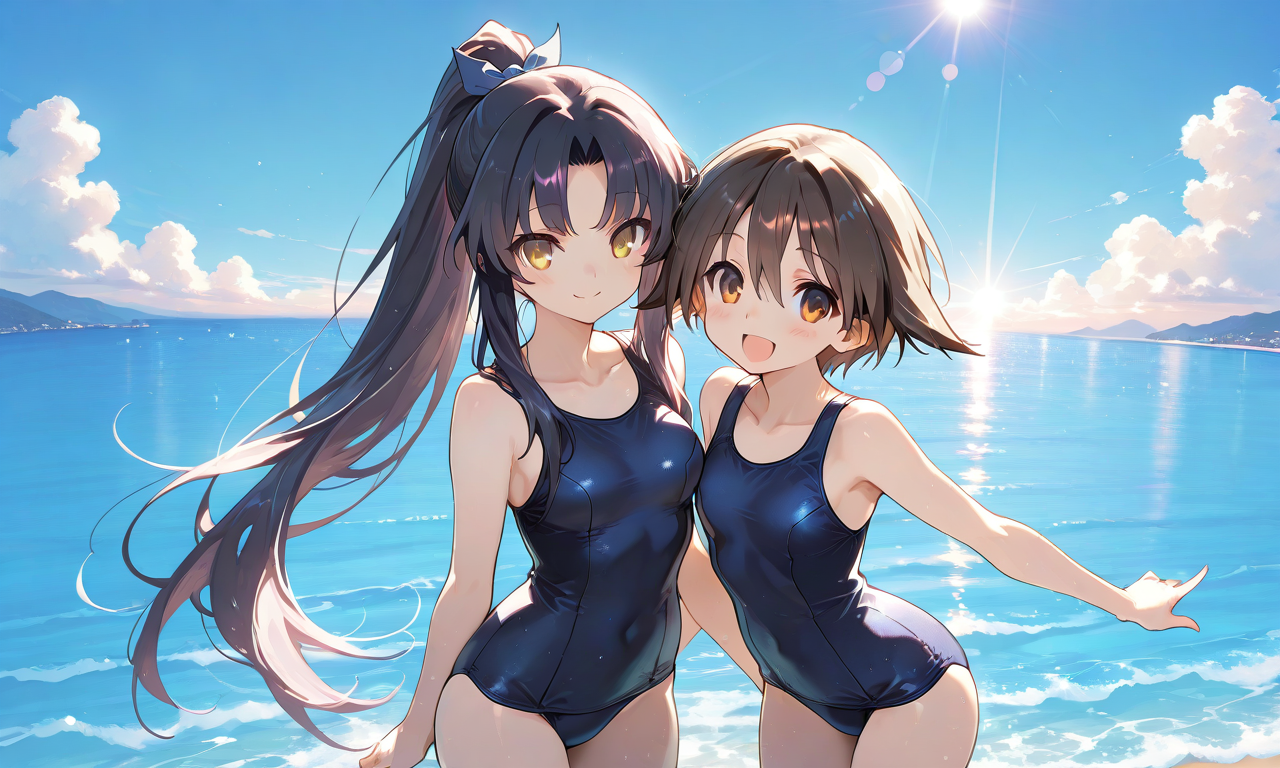 PixAI【Shiitake-Mix】2girls, miyafuji yoshika, hattori shizuka,yellow eyes, school swimsuit smile,open mouth, cowboy shot,ocean,summer,blue sky, sunlight,heavy lens flare,masterpiece,high quality, ,tokiame,((4k,8k,Ultra HD)),((Masterpiece :1.2)),((Best quality :1.2)),((Detailed :1.5)),((Detailed background :1.5)),Anime, moe,cinematic lighting , cinematic angle, soft light , color detail, backlighting, Depth of field, long exposure, light steps, intricate colors, vibrant colors,hyper-detailed, high contrast, depth of field, ray tracing, best lighting, cinematic composition, beautiful face, beautiful eyes, sharp focus, (masterpiece:1.2), (best quality:1.2), (very aesthetic:1.2), (absurdres:1.2), (detailed background),
