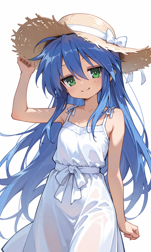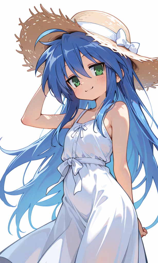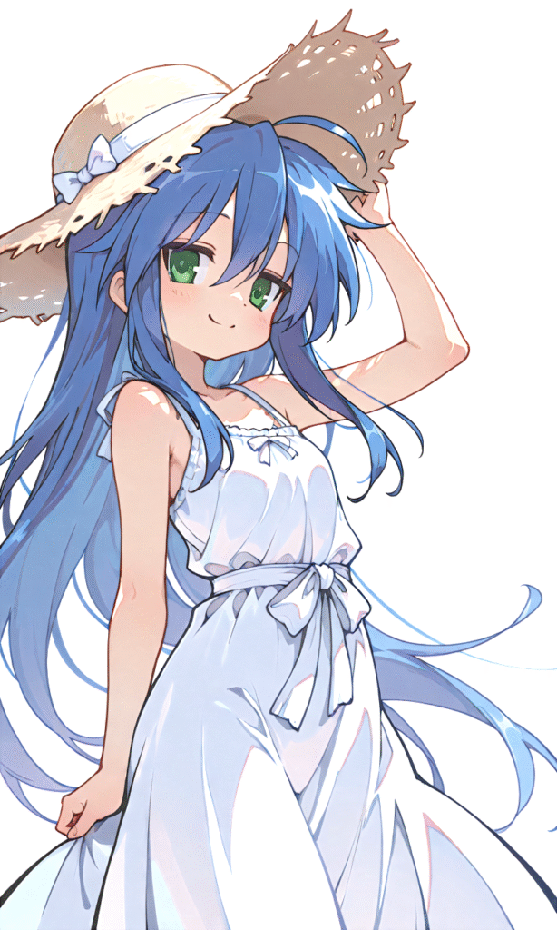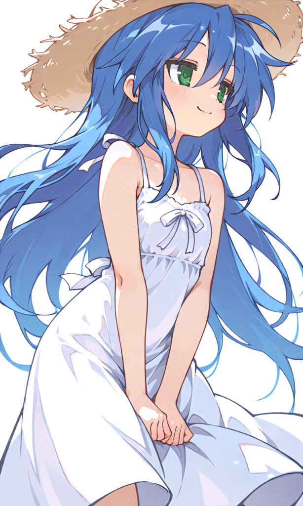 PixAI【Shiitake-Mix】izumi konata,no ahoge, smile,white sundress,long skirt, straw hat,cowboy shot,looking away, simplebackground,white background, masterpiece,high quality, ,tokiame,pastel style