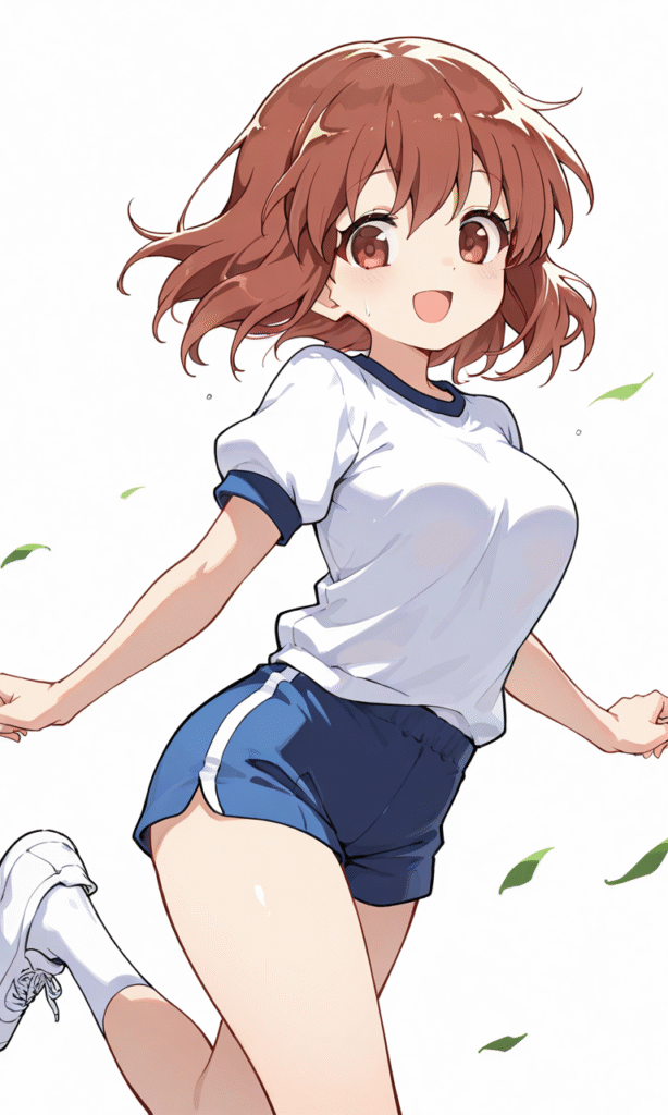 PixAI【Shiitake-Mix】inokuma youko(kiniro mosaic),medium hair,smile,open mouth,skipping, gym uniform,shorts, cowboy shot,simplebackground,white background, masterpiece,high quality, ,tokiame,NineV