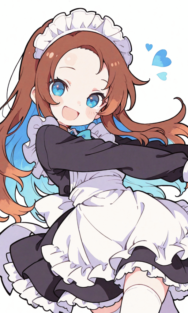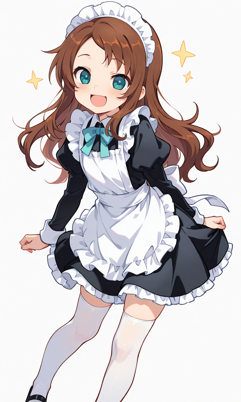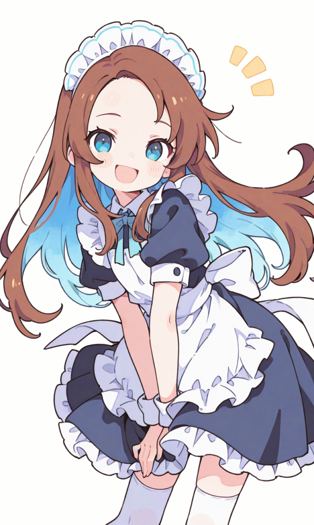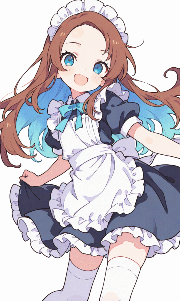 PixAI【Shiitake-Mix】saikawa riko,loli,solo,forehead,brown hair, long hair,straight hair, looking at viewer, smile,happy,open mouth, maid,short sleeves, white thighhighs, simplebackground,white background, masterpiece,high quality, ,tokiame, Flatline, Flat vector illustration, Vivid colors, white thick outline, outline, Blue Inner hair color, watercolor, soft light,