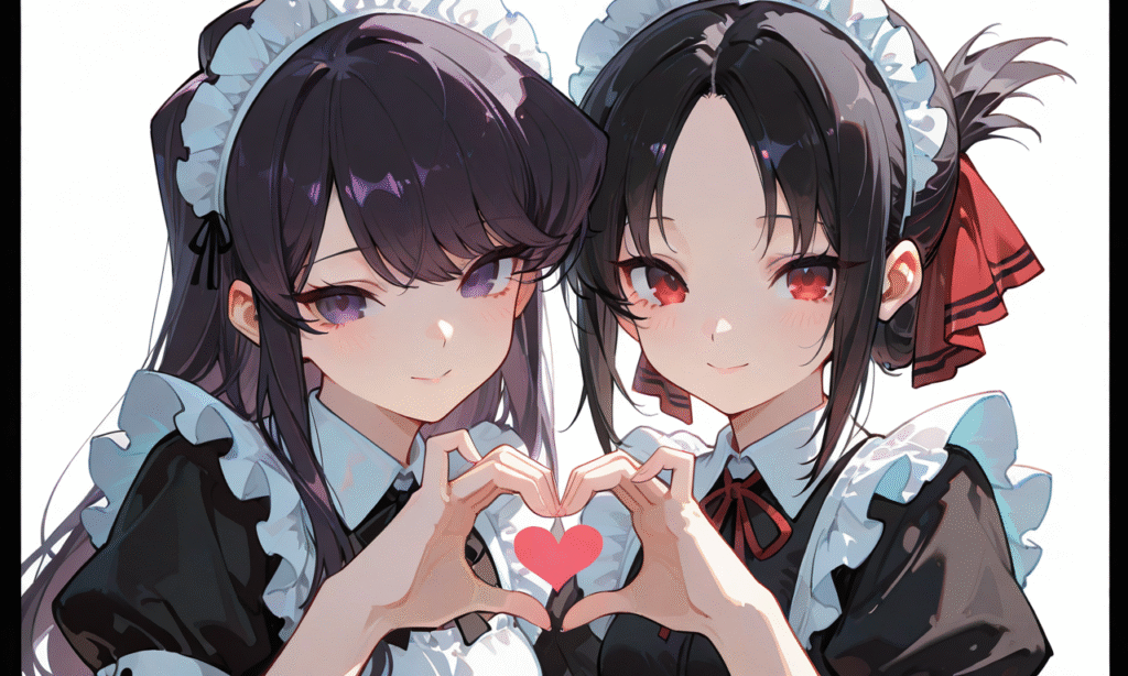 PixAI【Shiitake-Mix】2girls,shinomiya kaguya, komi shouko, maid,short sleeves, smile,open mouth, heart hands,symmetry, upper body, simplebackground,white background, masterpiece,high quality, ,tokiame,NineV,hyper-detailed, high contrast, depth of field, ray tracing, best lighting, cinematic composition, beautiful face, beautiful eyes, sharp focus, (masterpiece:1.2), (best quality:1.2), (very aesthetic:1.2), (absurdres:1.2), (detailed background)