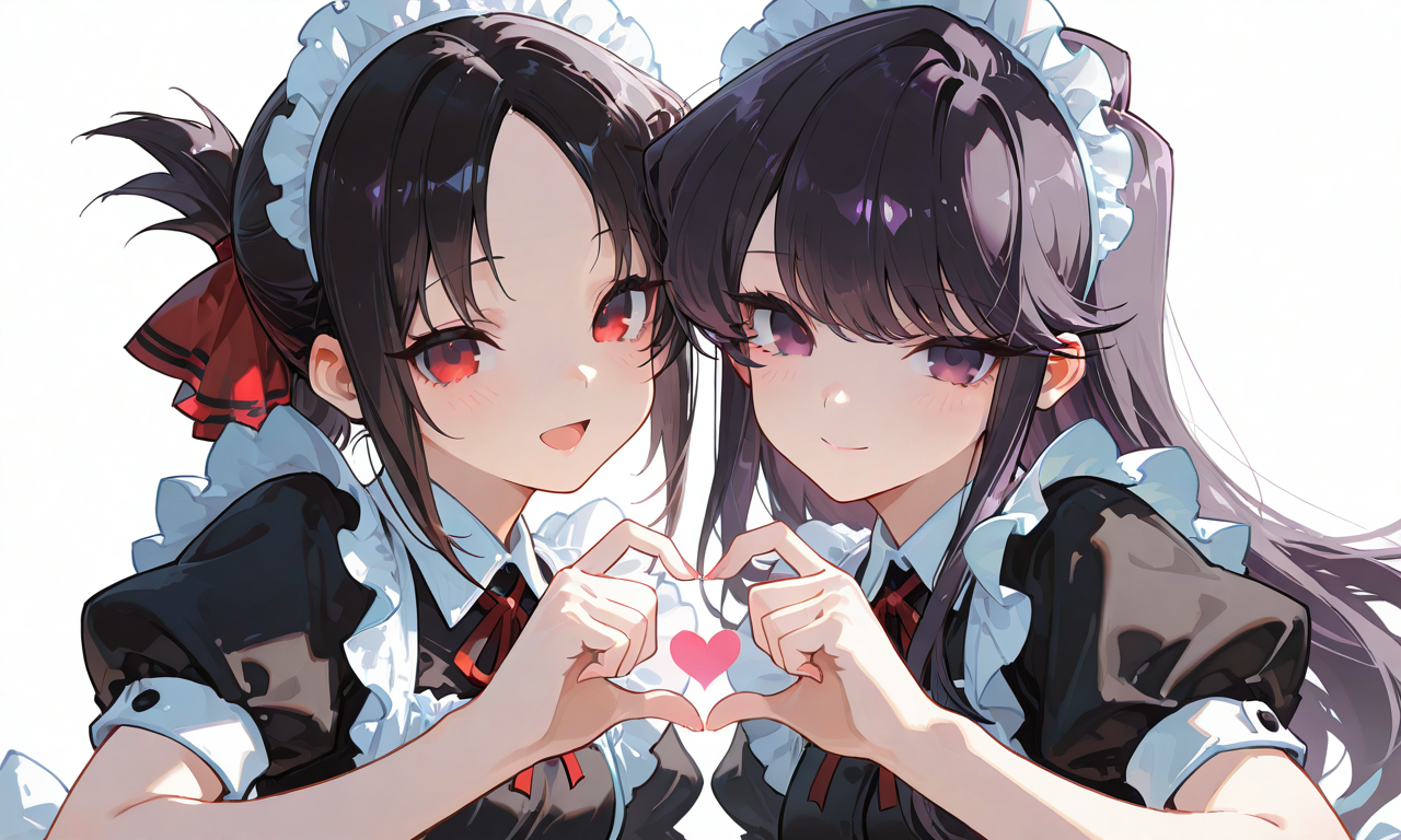 PixAI【Shiitake-Mix】2girls,shinomiya kaguya, komi shouko, maid,short sleeves, smile,open mouth, heart hands,symmetry, upper body, simplebackground,white background, masterpiece,high quality, ,tokiame,NineV,hyper-detailed, high contrast, depth of field, ray tracing, best lighting, cinematic composition, beautiful face, beautiful eyes, sharp focus, (masterpiece:1.2), (best quality:1.2), (very aesthetic:1.2), (absurdres:1.2), (detailed background)
