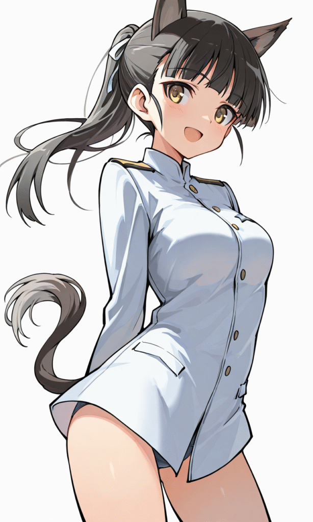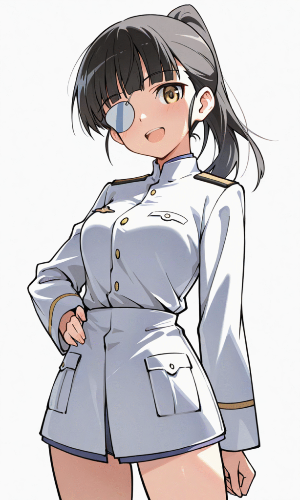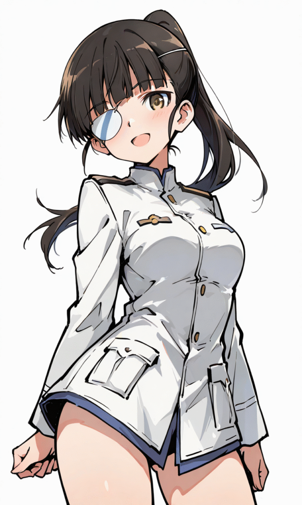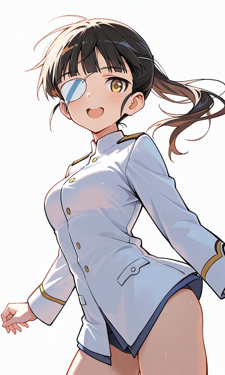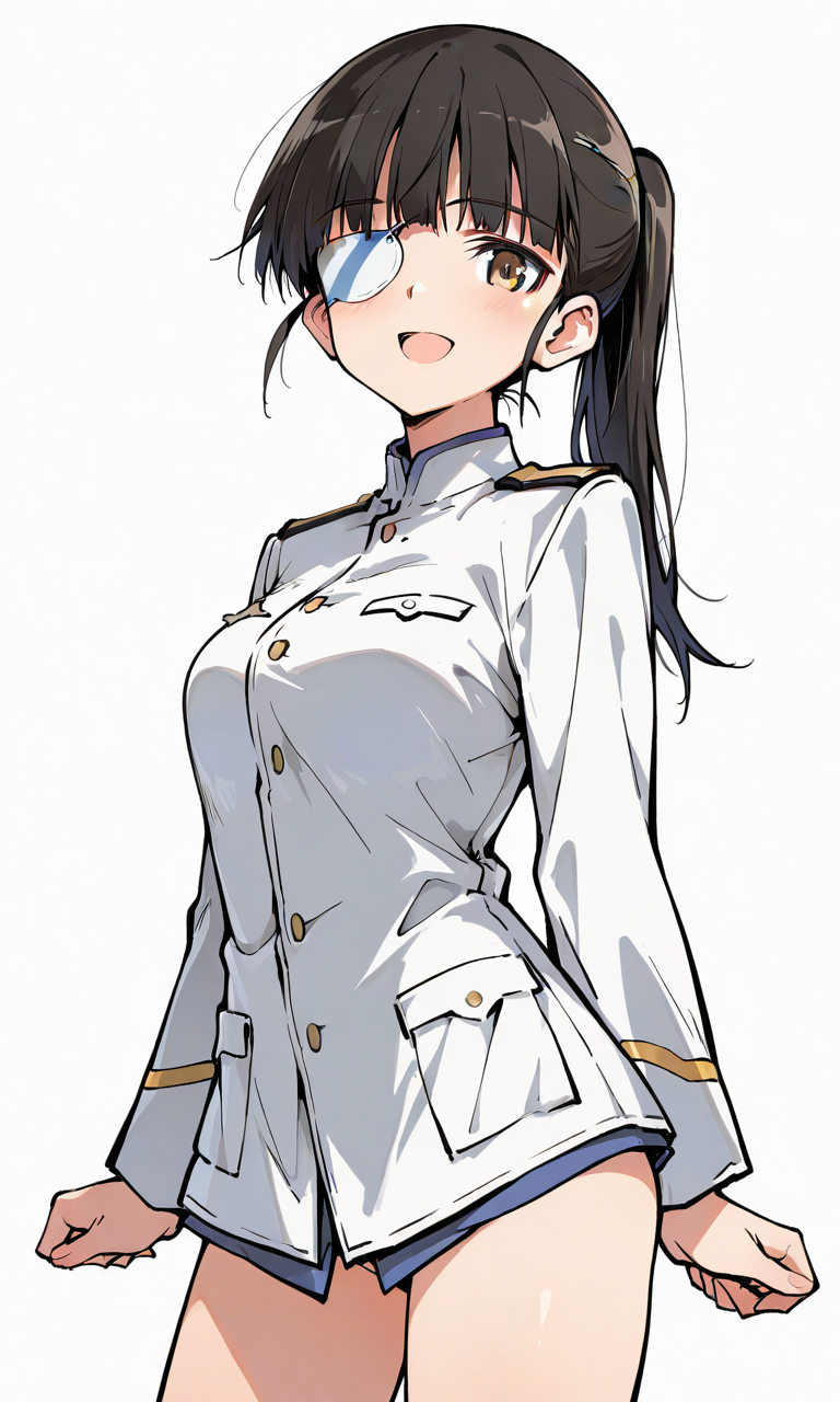 sakamoto mio(STRIKE WITCHES),no animal ears, no tail,ponytail,smile,open mouth,white uniform,aipatch,looking at viewer, cowboy shot,(simplebackground),(white background), masterpiece,high quality, high resolution