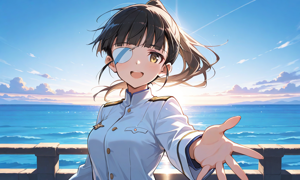 PixAI【Shiitake-Mix】sakamoto mio(STRIKE WITCHES),no animal ears,ponytail,smile,open mouth,white uniform,(aipatch),looking at viewer,upper body,outstretched hand, blue sky, sunlight,ocean,masterpiece,high quality, high resolution