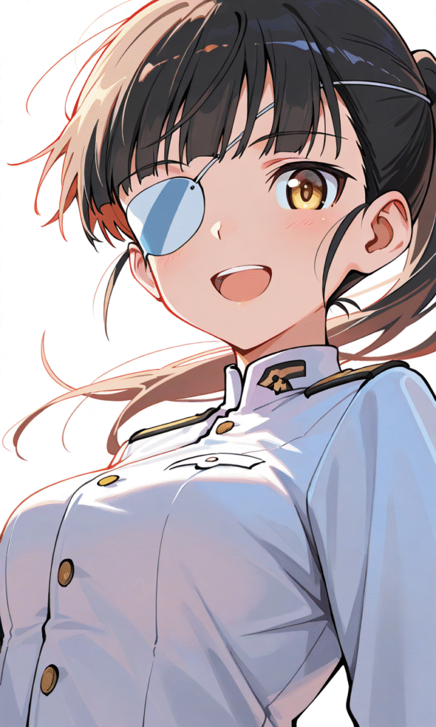 sakamoto mio(STRIKE WITCHES),no animal ears, no tail,ponytail,smile,open mouth,white uniform,aipatch,looking at viewer,upper body, (simplebackground),(white background), masterpiece,high quality, high resolution