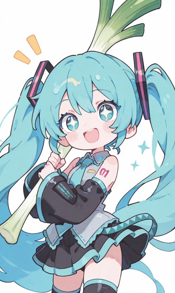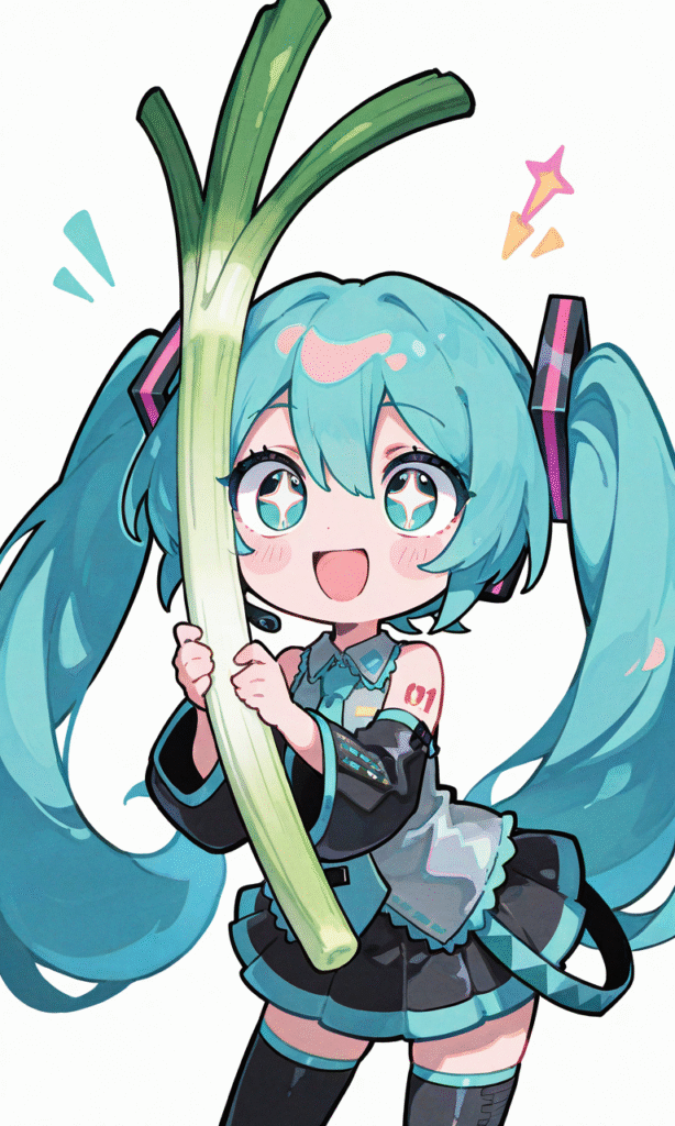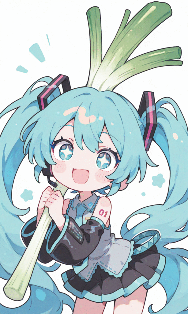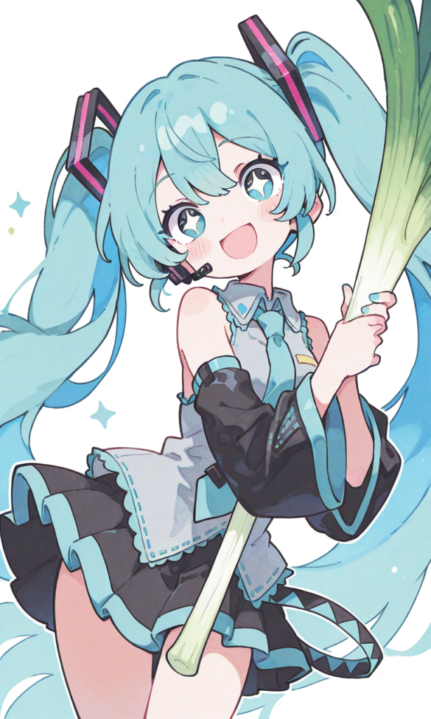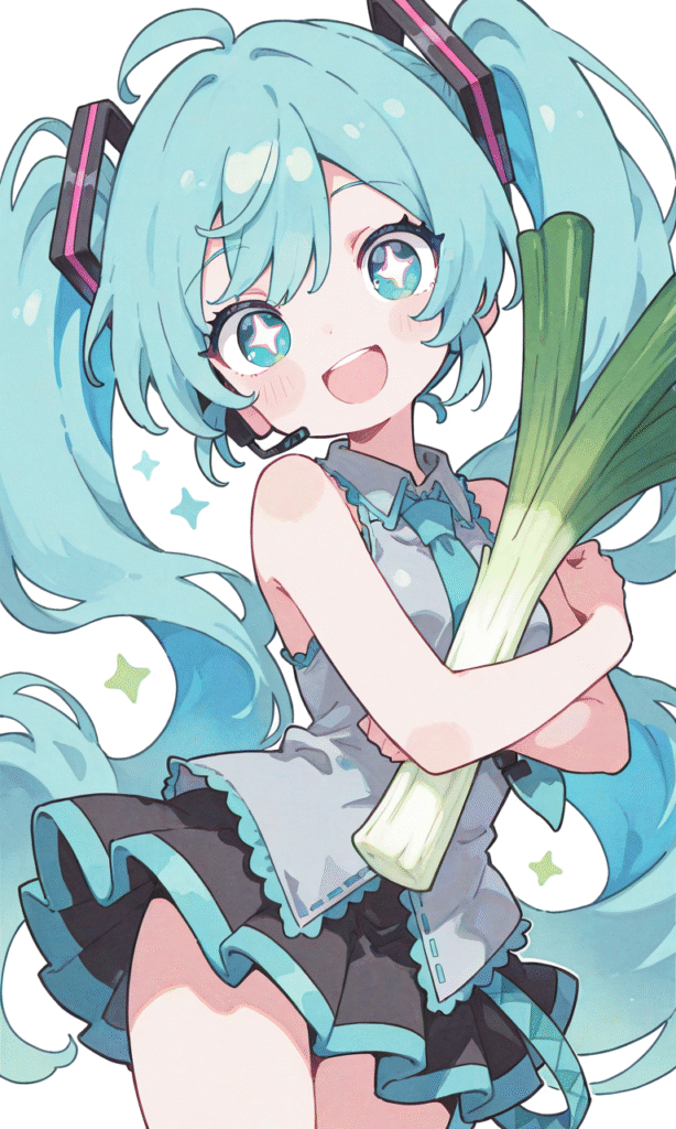 PixAI【Shiitake-Mix】hatsune miku,solo, smile,((holding Japanese long onion)),open mouth, cowboy shot,simplebackground,white background, masterpiece,high quality,