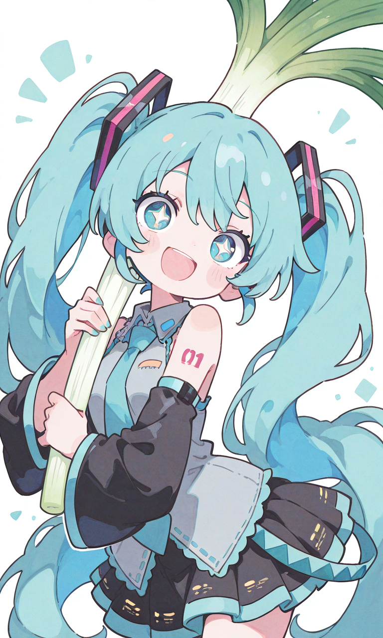 PixAI【Shiitake-Mix】hatsune miku,solo, smile,((holding Japanese long onion)),open mouth, cowboy shot,simplebackground,white background, masterpiece,high quality,