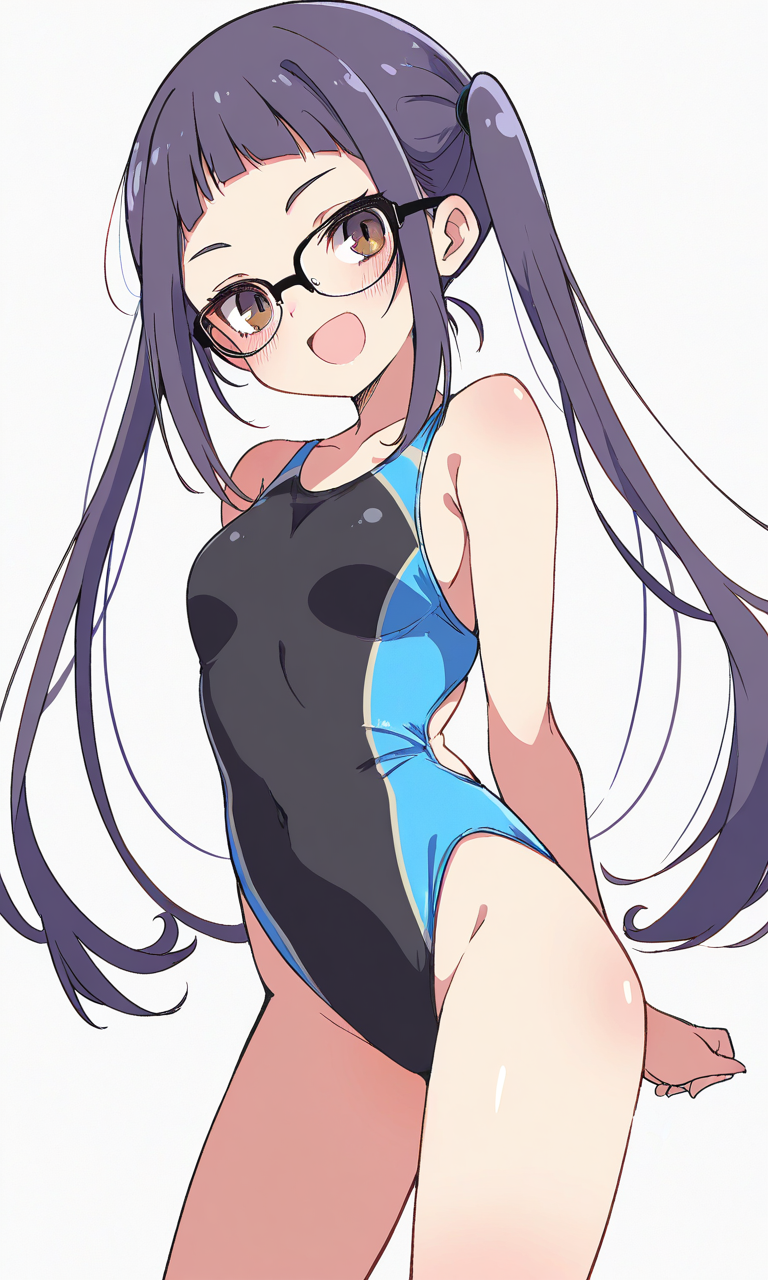 PixAI【Shiitake-Mix】oogaki chiaki,glasses,twintail,competition swimsuit, smile,open mouth, medium breast,looking at viewer, cowboy shot,simplebackground,white background, masterpiece,high quality, high resolution