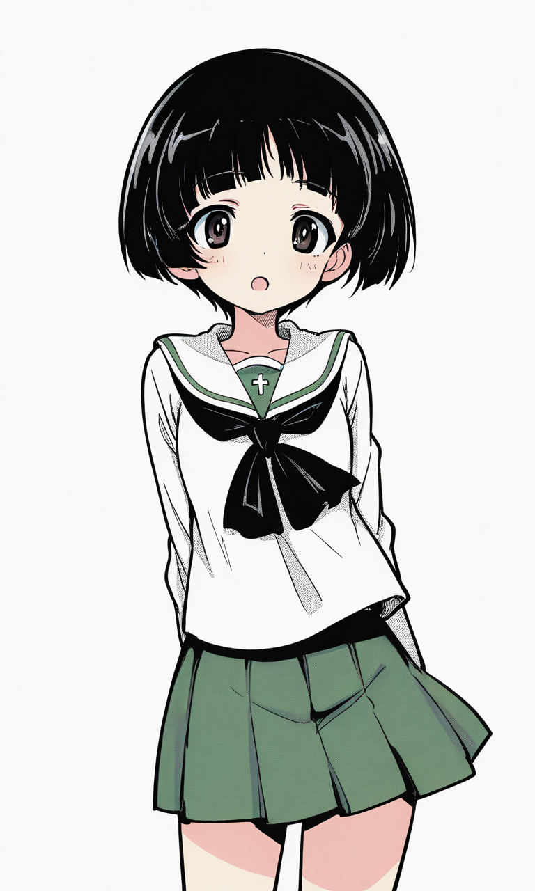 PixAI【Shiitake-Mix】sono midoriko(girls und panzer), ooarai school uniform, very short hair, black hair, straight hair,blunt bangs,short bangs,volumey,tareme,open mouth, looking at viewer, cowboy shot,standing, simplebackground,white background, masterpiece,high quality, high resolution