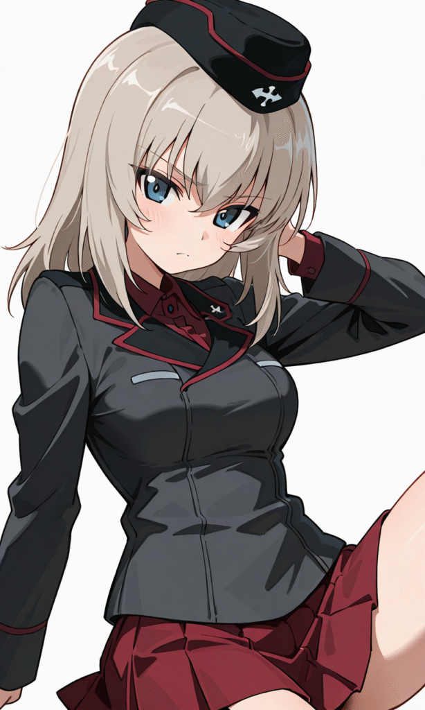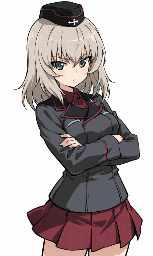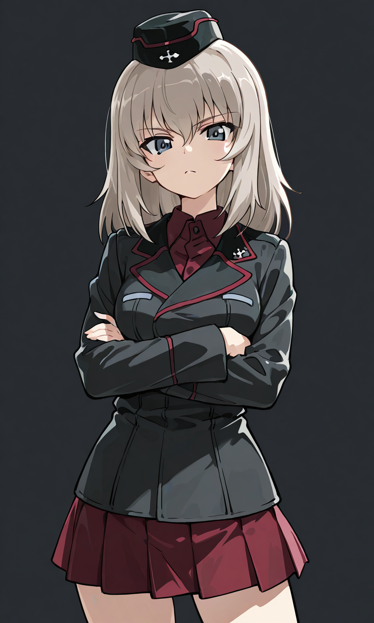 PixAI【Shiitake-Mix】itsumi erika (girls und panzer),solo, kuromorimine school uniform, red miniskirt, frown, jacket, military hat, dress shirt, kuromorimine military uniform, insignia, garrison cap, long sleeves, military uniform, shirt,looking at viewer,crossed arms, hat, pleated skirt,simplebackground,white background, masterpiece,high quality, tokiame