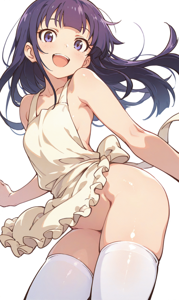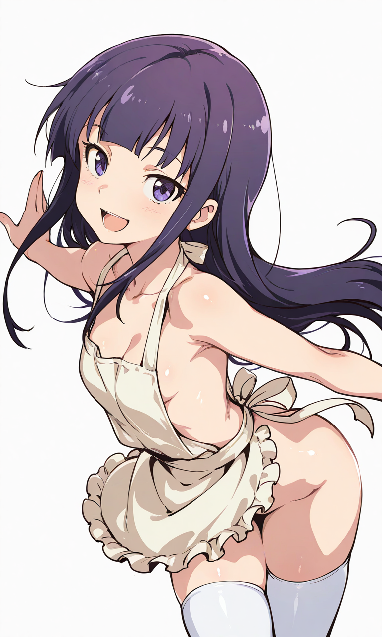 PixAI【Shiitake-Mix】1girl, yamada aoi (working!!), smile, open mouth, dynamic pose, looking at viewer, cowboy shot, apron over naked, white thighhighs, simple background, white background, masterpiece, high quality, shiny skin, shiny, tokiame