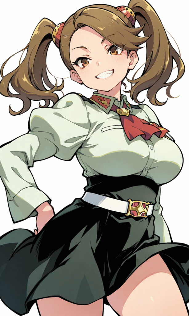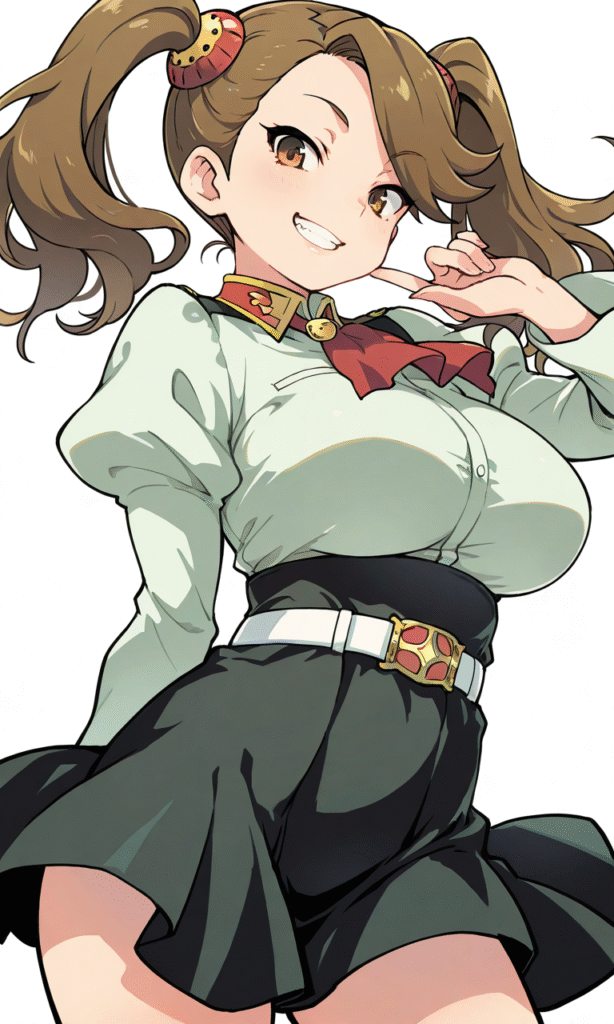 sazaki kaoruko, 1girl, grin, high-waist skirt, white belt, cowboy shot, simple background, white background, masterpiece, high quality, tokiame