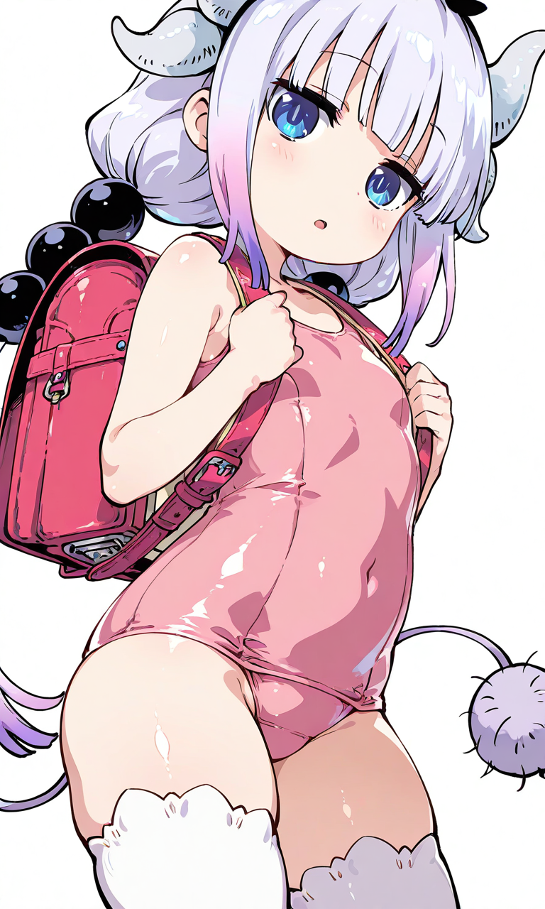 PixAI【Shiitake-Mix】1girl, kanna kamui(miss kobayashi’s dragon maid), no horn, open mouth, looking at viewer, pink school swimsuit, randoseru, white thighhighs, cowboy shot, simple background, white background, masterpiece, high quality, shiny skin, shiny, tokiame