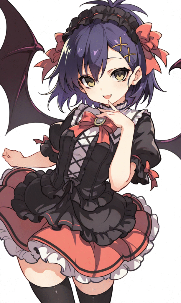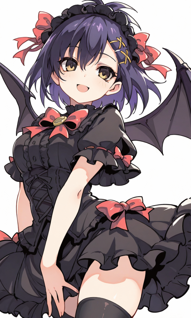 vignette tsukinose april,solo,smile,open mouth,yellow eyes, gothic lolita,short sleeves, black thighhighs, bat wings, cowboy shot,simplebackground,white background, masterpiece,high quality,tokiame,Anime, moe
