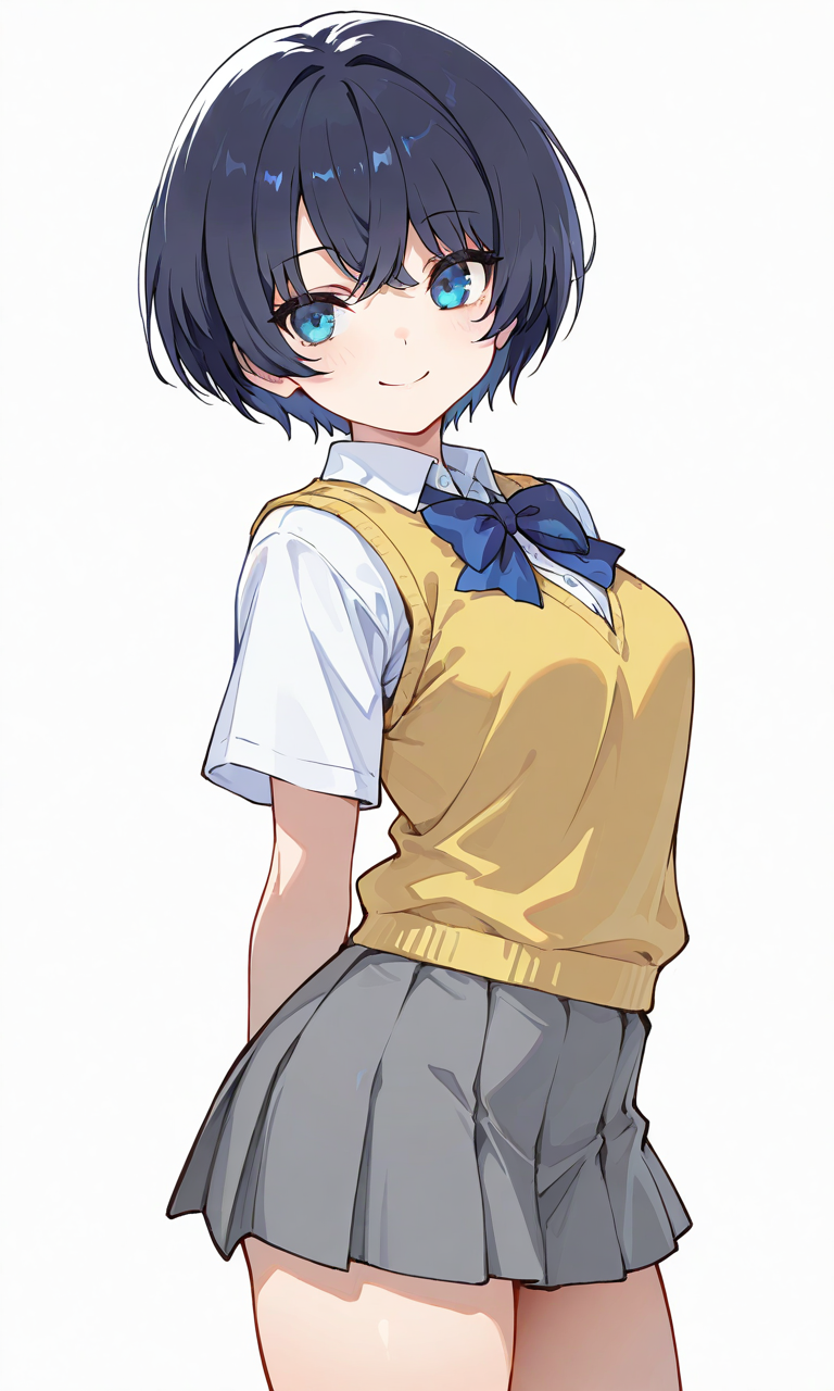 PixAI【Shiitake-Mix】tanigawa kanna, smile,school uniform, dress shirt, short sleeves,yellow wool vest,blue bowtie, gray miniskirt,cowboy shot,simplebackground,white background,masterpiece,high quality,tokiame