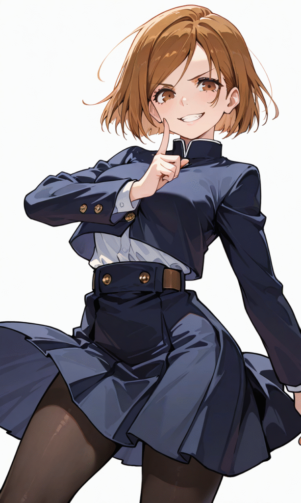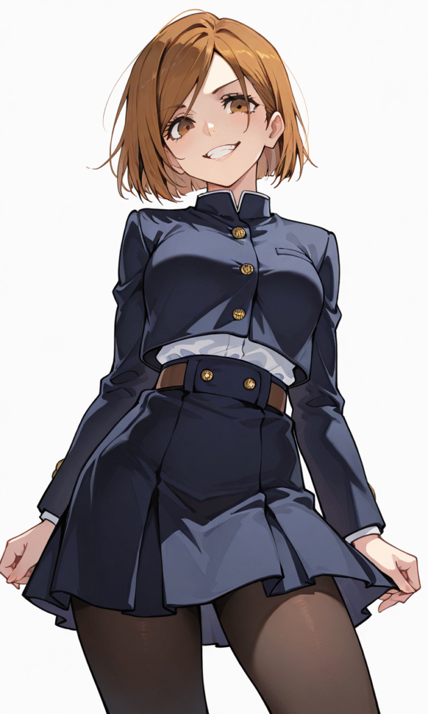 PixAI【Shiitake-Mix】kugisaki nobara,grin,school uniform,jujutsu tech uniform, gakuran, pantyhose, cowboy shot,simplebackground,white background, masterpiece,high quality, ,tokiame,shiny skin, shiny, flat color style, simple coloring style,