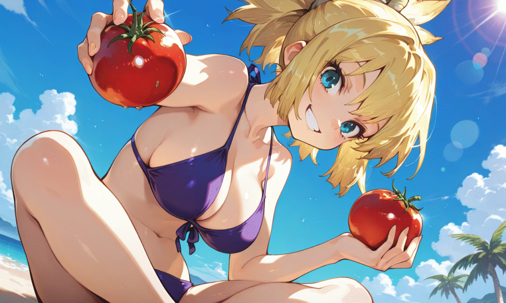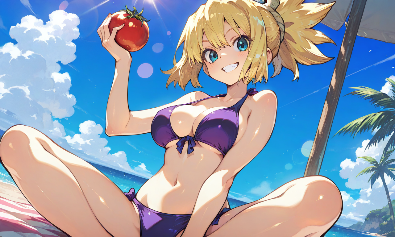 PixAI【Shiitake-Mix】kohaku (dr. stone), grin,purple bikini,indian style, holding tomato,beach,summer,blue sky, sunlight,heavy lens flare, masterpiece,high quality, ,shiny skin, shiny,tokiame,((4k,8k,Ultra HD)),((Masterpiece :1.2)),((Best quality :1.2)),((Detailed :1.5)),((Detailed background :1.5))