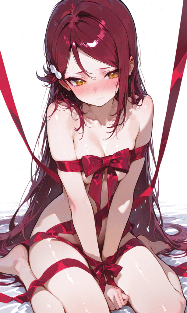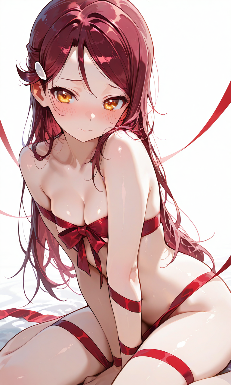 PixAI【Shiitake-Mix】sakurauchi riko(lovelive),nude,((roll red ribbon)),red bow, embarrassed,blush,cowboy shot,wariza,sheet,simplebackground,white background, masterpiece,high quality, ,shiny skin, shiny,hyper-detailed, high contrast, depth of field, ray tracing, best lighting, cinematic composition, beautiful face, beautiful eyes, sharp focus, (masterpiece:1.2), (best quality:1.2), (very aesthetic:1.2), (absurdres:1.2), (detailed background),tokiame