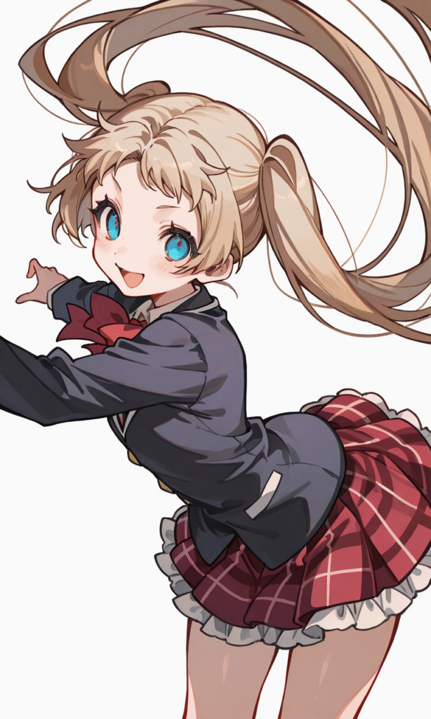 dekomori sanae,icho private high school uniform, smile,open mouth, very long hair, dynamic pose, cowboy shot,simplebackground,white background, masterpiece,high quality, ,tokiame,thstl_style