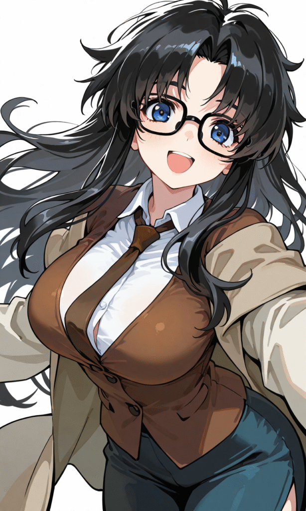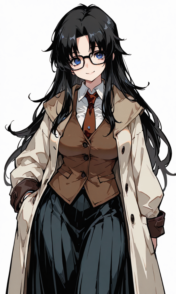 PixAI【Shiitake-Mix】yomiko readman, smile,vest,coat,long skirt, cowboy shot,simplebackground,white background, masterpiece,high quality, high resolution