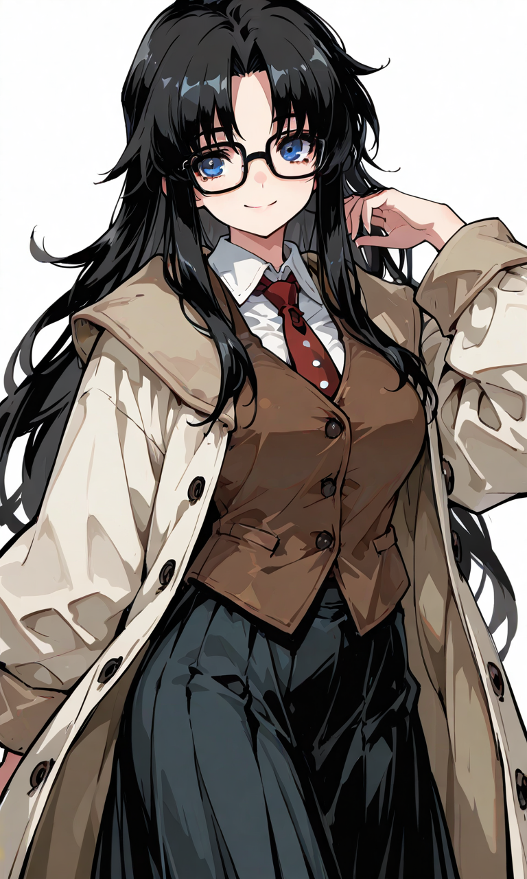 PixAI【Shiitake-Mix】yomiko readman, smile,vest,coat,long skirt, cowboy shot,simplebackground,white background, masterpiece,high quality, high resolution