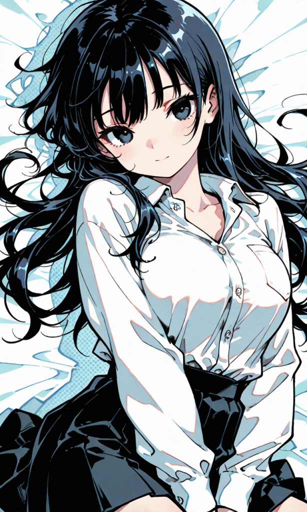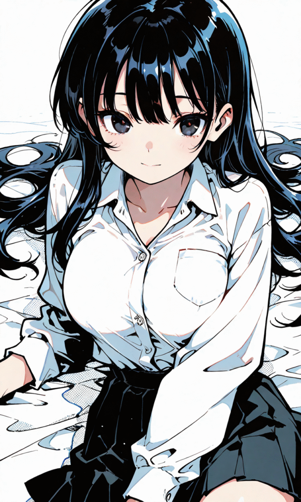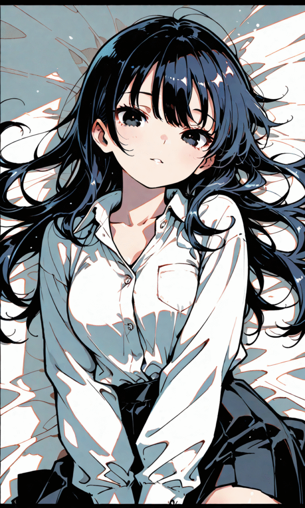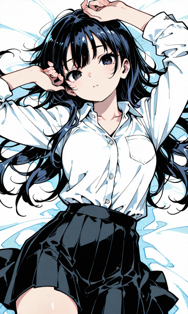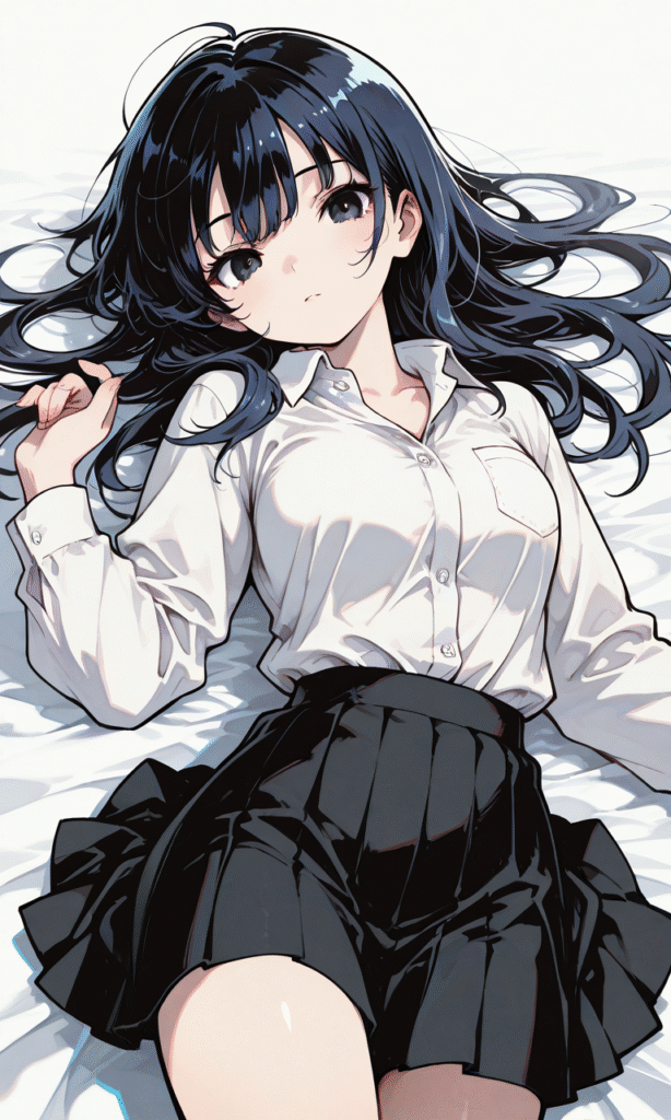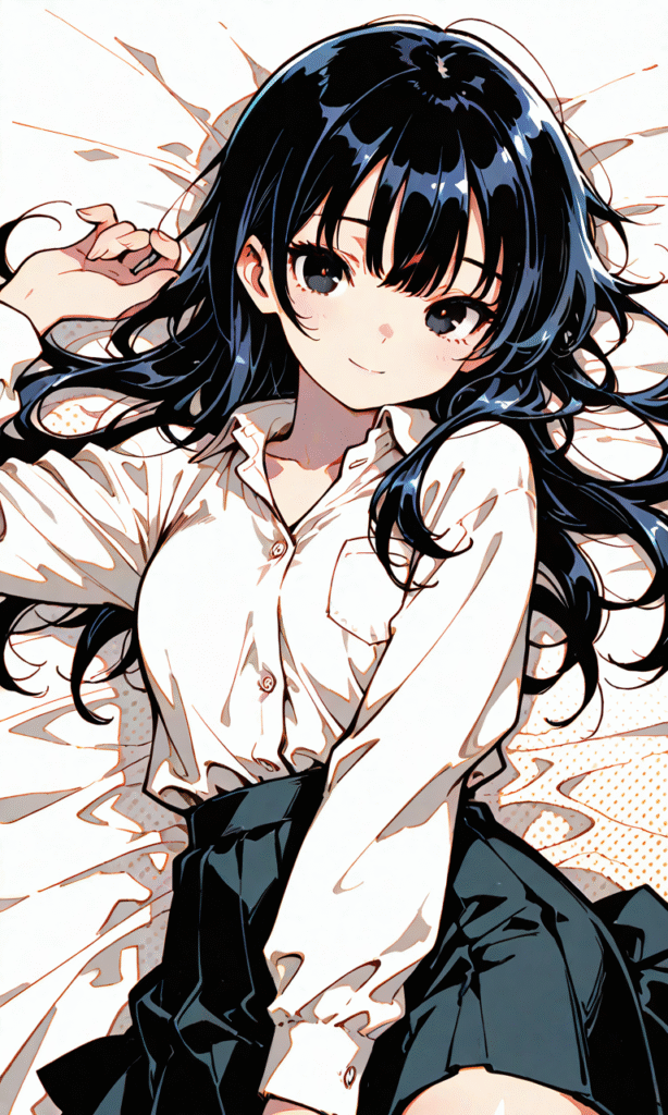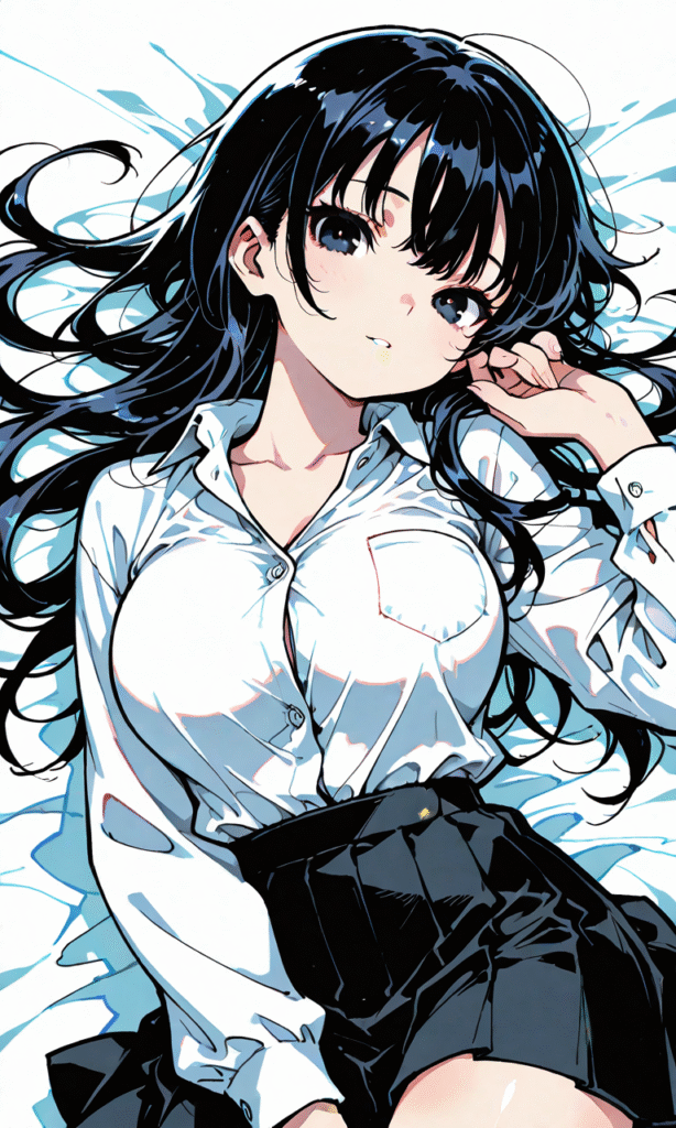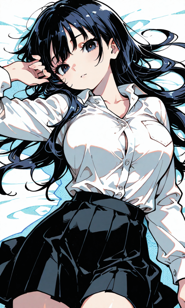PixAI【Shiitake-Mix】yamada anna,school uniform, dress shirt,open collar,((no bowtie)),skirt,ennui,lying,black eyes,((large breast)), cowboy shot,sheet,simplebackground,white background, masterpiece,high quality, high resolution,tokiame,hyper-detailed, high contrast, depth of field, ray tracing, best lighting, cinematic composition, beautiful face, beautiful eyes, sharp focus, (masterpiece:1.2), (best quality:1.2), (very aesthetic:1.2), (absurdres:1.2), (detailed background),manga-texture, tone-art-style, dot-manga-style, screentone texture, halftone shading, printed texture