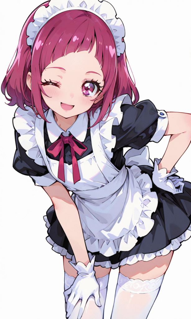 PixAI【Shiitake-Mix】nono hana(precure),forehead,asymmetrical bangs,maid,short sleeves, white thighhighs, white gloves, one eye closed, leaning forward,hand_on_own_hip,smile,open mouth, cowboy shot,simplebackground,white background, masterpiece,high quality, high resolution,tokiame,748cmstyle
