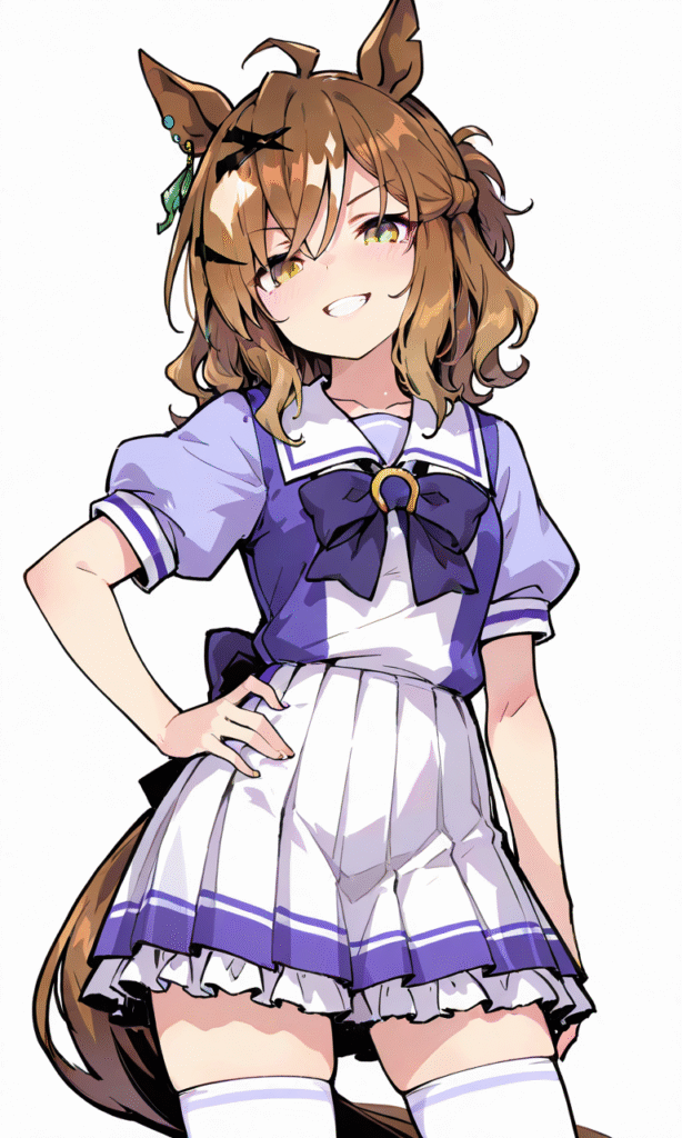 PixAI【Shiitake-Mix】jungle pocket (umamusume),tracen school uniform,short sleeves, white thighhighs, looking at viewer, hand_on_own_hip,open mouth,grin, cowboy shot,simplebackground,white background, masterpiece,high quality, high resolution,tokiame,NineV