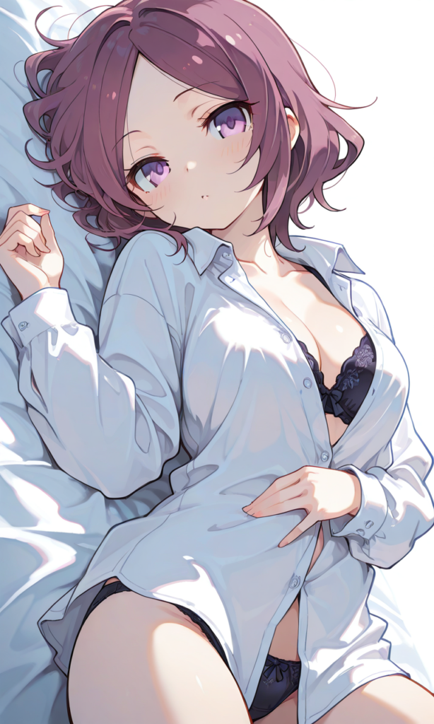 NEW GAME,tooyama rin,purple eyes,ennui ,dress shirt, lying,open collar,bra,panties,cowboy shot,sheet,simplebackground,white background, masterpiece,high quality, high resolution,hyper-detailed, high contrast, depth of field, ray tracing, best lighting, cinematic composition, beautiful face, beautiful eyes, sharp focus, (masterpiece:1.2), (best quality:1.2), (very aesthetic:1.2), (absurdres:1.2), (detailed background),tokiame,Anime, moe