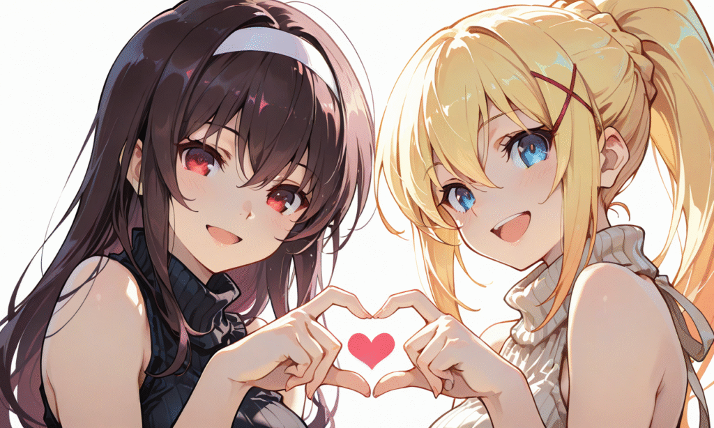PixAI【Shiitake-Mix】2girls,darkness (konosuba), kasumigaoka utaha,virgin killer sweater((white)), looking at viewer, smile,open mouth, upper body,heart hands, simplebackground,white background, masterpiece,high quality, ,tokiame,hyper-detailed, high contrast, depth of field, ray tracing, best lighting, cinematic composition, beautiful face, beautiful eyes, sharp focus, (masterpiece:1.2), (best quality:1.2), (very aesthetic:1.2), (absurdres:1.2), (detailed background),