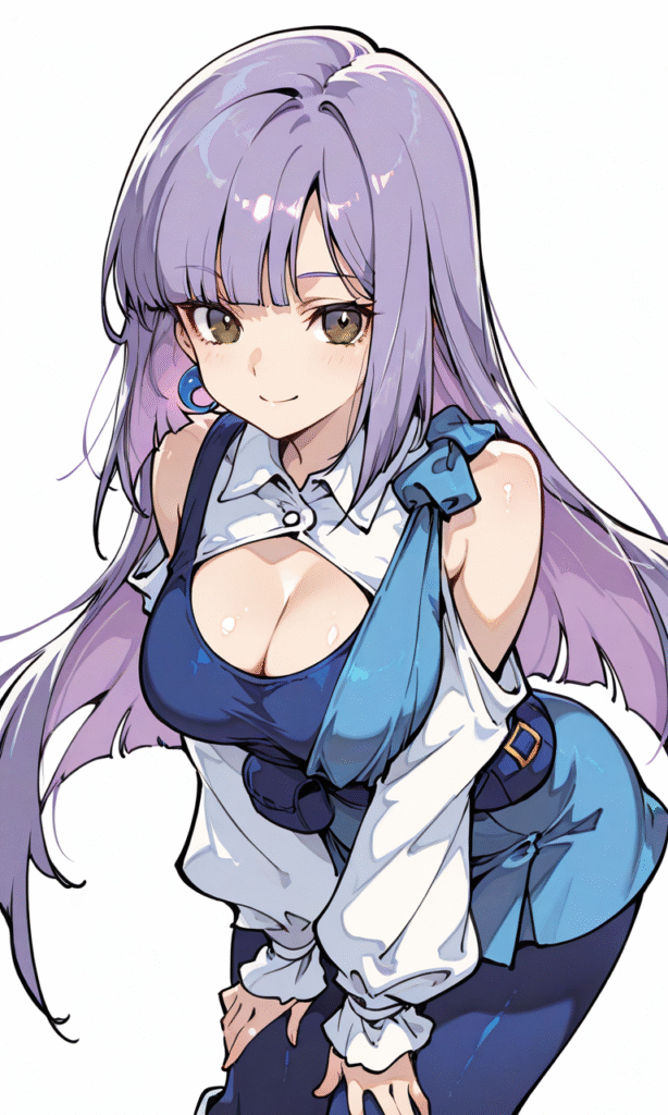 PixAI【Shiitake-Mix】roux louka,smile,cowboy shot,leaning forward,simplebackground,white background, masterpiece,high quality, high resolution,tokiame,1girl, solo, RouxLouka, lavender hair, hime cut, long hair, brown eyes, blue tanktop, cleavage cutout, white sleeves, bare shoulder, light blue short dress, fanny pack, blue pantyhose, light blue legwarmers, white boots, blue crescent earing,shiny skin, shiny