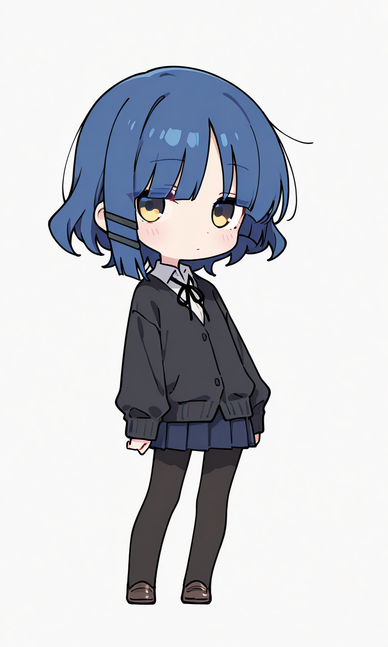 PixAI【Shiitake-Mix】yamada ryo, solo, school uniform, long sleeves, black cardigan, pantyhose, looking at viewer, cowboy shot, simple background, white background, masterpiece, high quality, tokiame, flat color style, simple coloring style, chibi, big head, small body, large eyes, blush, simple lines, bright colors, simple colors, cute