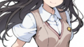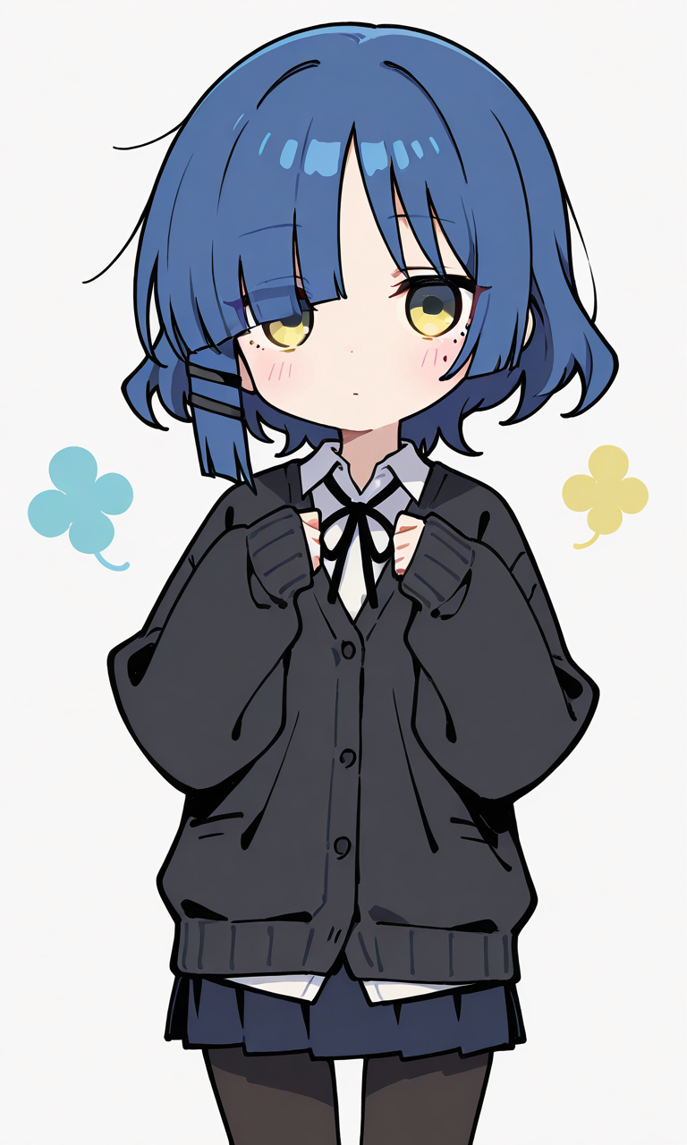 PixAI【Shiitake-Mix】yamada ryo, solo, school uniform, long sleeves, black cardigan, pantyhose, looking at viewer, cowboy shot, simple background, white background, masterpiece, high quality, tokiame, flat color style, simple coloring style, chibi, big head, small body, large eyes, blush, simple lines, bright colors, simple colors, cute