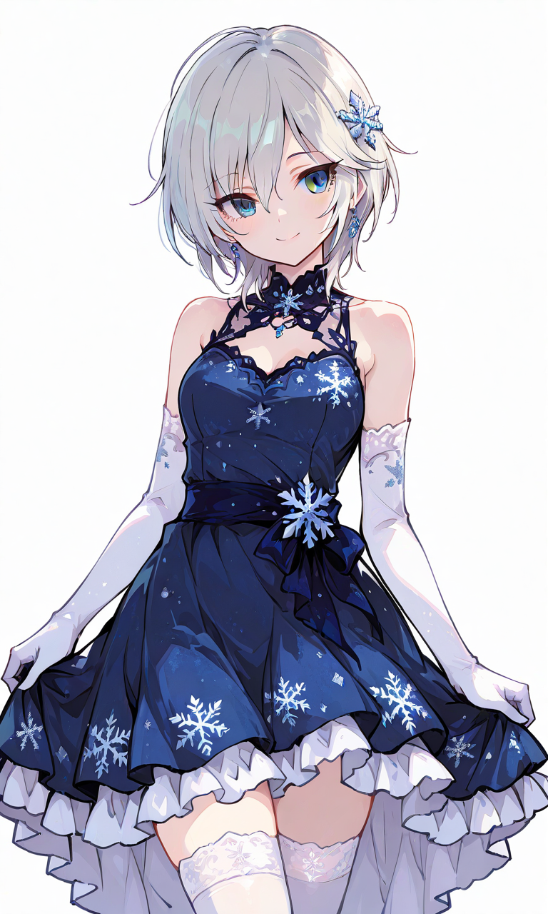PixAI【Shiitake-Mix】1girl, anastasia (idolmaster), dark blue dress, snowflake print, white thighhighs, elbow gloves, smile, cowboy shot, simple background, white background, masterpiece, high quality, high resolution, tokiame, 748cmstyle