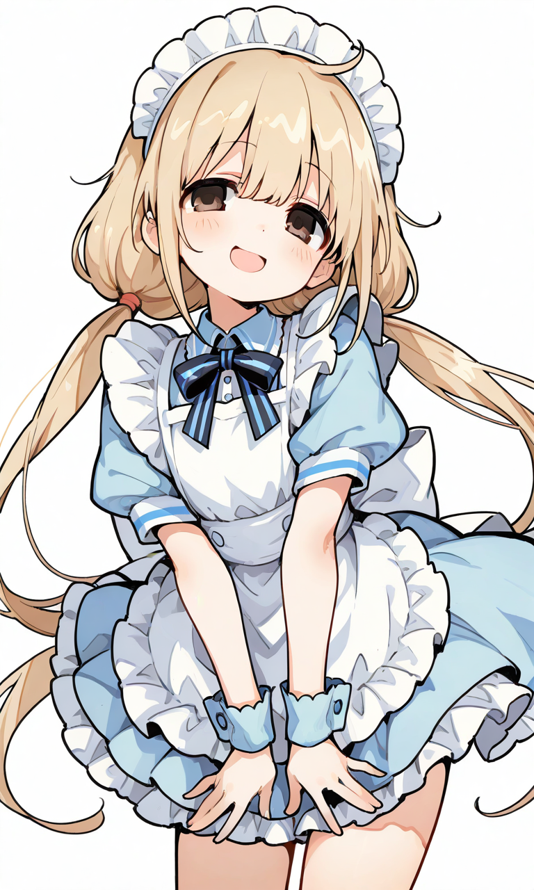 PixAI【Shiitake-Mix】futaba anzu, smile,open mouth,light blue maid, cowboy shot,simplebackground,white background, masterpiece,high quality, high resolution