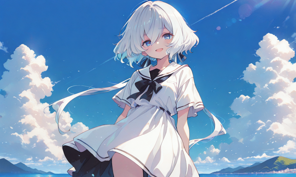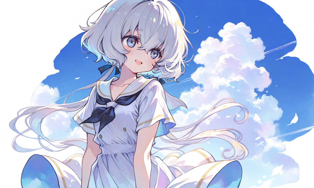 PixAI【Shiitake-Mix】konno junko,white sailor dress,short sleeves, smile,open mouth, cowboy shot,summer,blue sky, simplebackground,white background, masterpiece,high quality,tokiame,,,,,watercolor,Beautiful eyes,detailed,soft colors