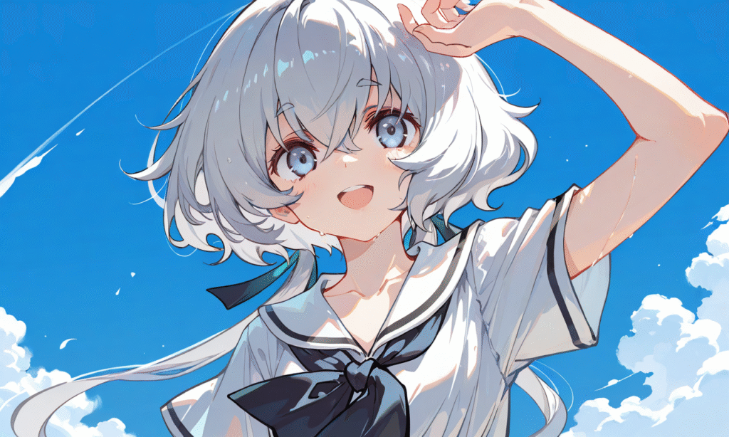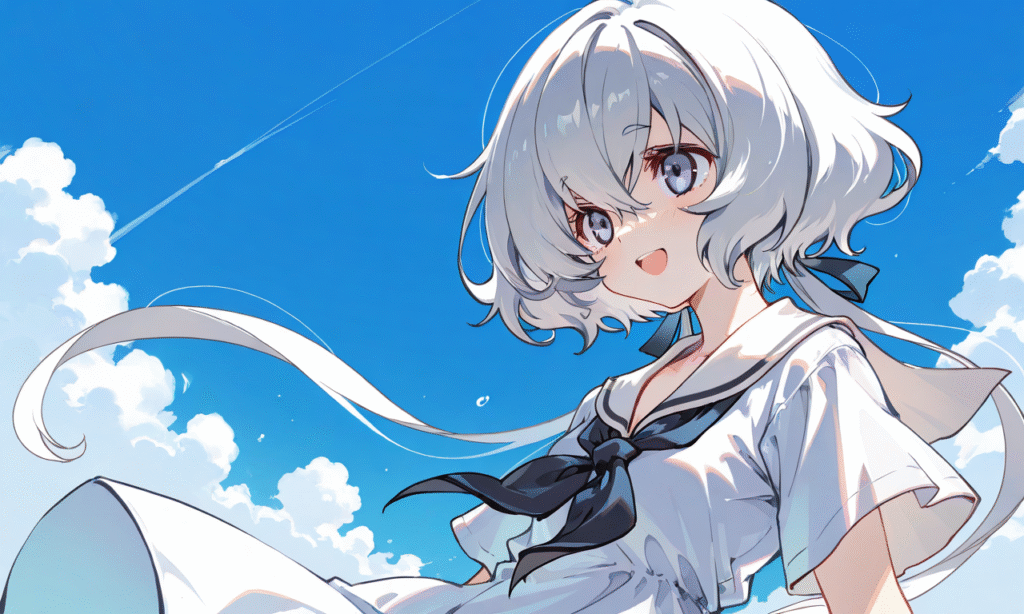 konno junko,white sailor dress,short sleeves, smile,open mouth, cowboy shot,summer,blue sky, simplebackground,white background, masterpiece,high quality,tokiame,EyeDetailerXL,hyper-detailed, high contrast, depth of field, ray tracing, best lighting, cinematic composition, beautiful face, beautiful eyes, sharp focus, (masterpiece:1.2), (best quality:1.2), (very aesthetic:1.2), (absurdres:1.2), (detailed background), Fantasy Scene, ,748cmstyle,Flat color, anime screencap,[artist: deal360acv]