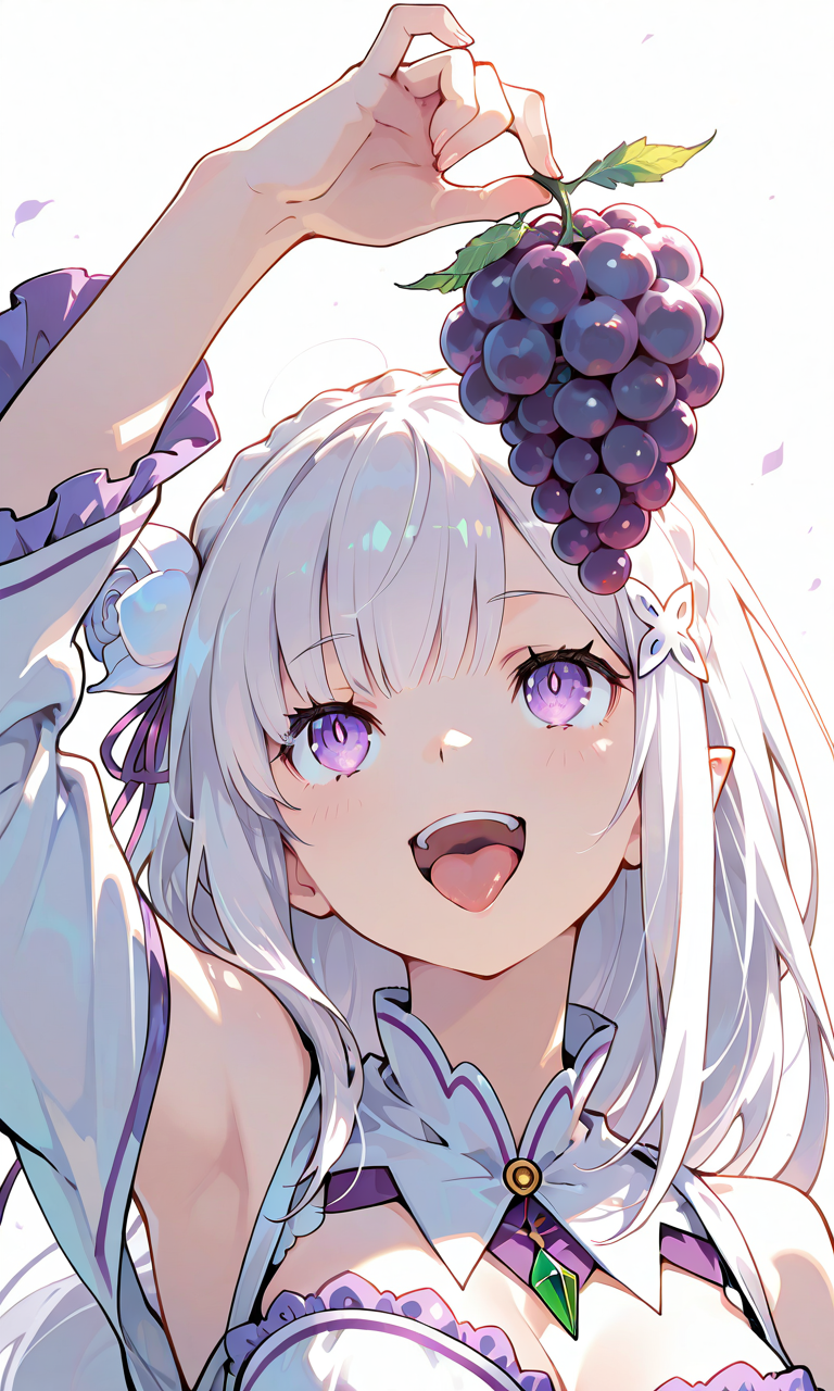 PixAI【Shiitake-Mix】emilia (re:zero), smile, open mouth, eating big grapes, arm up, tongue out, upper body, looking up, simple background, white background, masterpiece, high quality, high resolution, tokiame, fantasy scene, hyper-detailed, high contrast, depth of field, ray tracing, best lighting, cinematic composition, beautiful face, beautiful eyes, sharp focus, (masterpiece:1.2), (best quality:1.2), (very aesthetic:1.2), (absurdres:1.2), detailed background