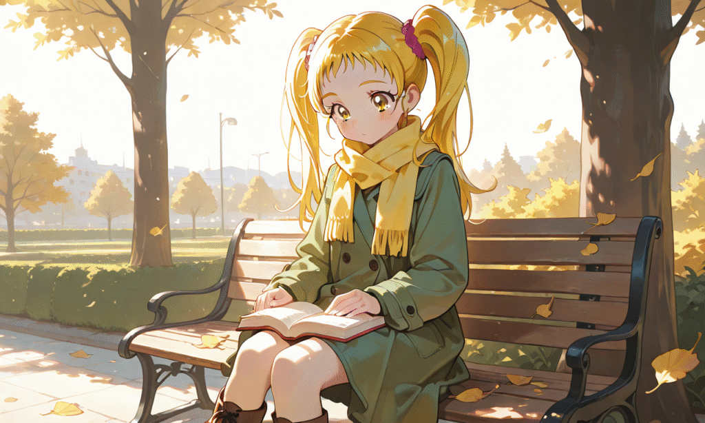 PixAI【Shiitake-Mix】kasugano urara (yes! precure 5), solo, yellow hair, twintail, solo, 1girl, quiet, sitting on park bench, reading book, vintage-style long coat, deep olive green, lace-up boots, mustard yellow scarf, fallen leaves, introspective, poetic, cowboy shot, masterpiece, high quality, high resolution, hyper-detailed, high contrast, depth of field, ray tracing, best lighting, cinematic composition, beautiful face, beautiful eyes, sharp focus, (masterpiece:1.2), (best quality:1.2), (very aesthetic:1.2), (absurdres:1.2), detailed background, pastel style