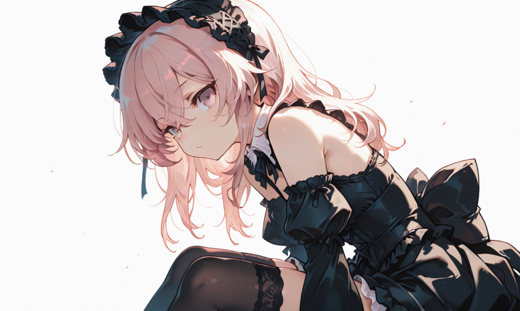 inui sajuna, gothic lolita, white collar, lace thighhighs, sitting, from side, cowboy shot, simple background, white background, masterpiece, high quality, high resolution, tokiame, fantasy scene, hyper-detailed, high contrast, depth of field, ray tracing, best lighting, cinematic composition, beautiful face, beautiful eyes, sharp focus, (masterpiece:1.2), (best quality:1.2), (very aesthetic:1.2), (absurdres:1.2), detailed background