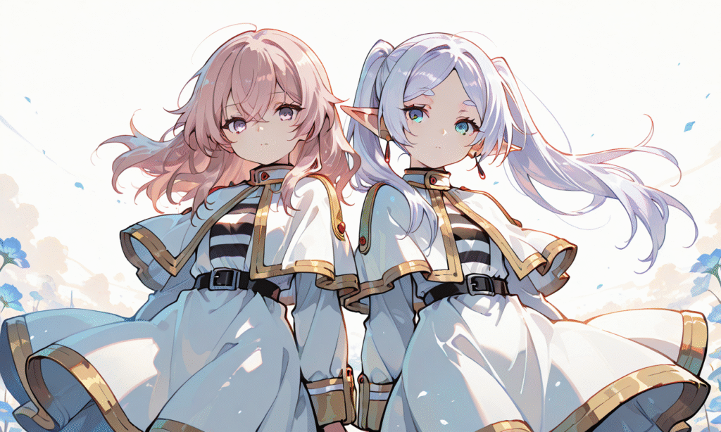 PixAI【Shiitake-Mix】2girls, frieren, inui sajuna, looking at viewer, twintail, frieren(cosplay), shoulder-to-shoulder, cowboy shot, simple background, white background, masterpiece, high quality, high resolution, tokiame, hyper-detailed, high contrast, depth of field, ray tracing, best lighting, cinematic composition, beautiful face, beautiful eyes, sharp focus, (masterpiece:1.2), (best quality:1.2), (very aesthetic:1.2), (absurdres:1.2), (detailed background), Fantasy Scene, tokiame, hyper-detailed, high contrast, depth of field, ray tracing, best lighting, cinematic composition, beautiful face, beautiful eyes, sharp focus, (masterpiece:1.2), (best quality:1.2), (very aesthetic:1.2), (absurdres:1.2), (detailed background), Fantasy Scene