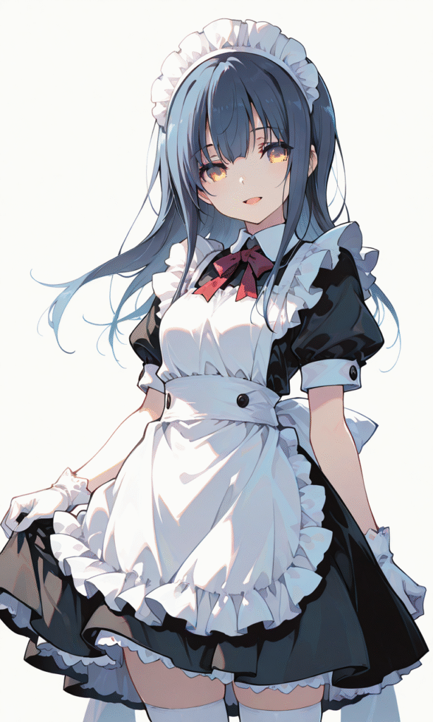 yoroizuka mizore, 1girl, yellow eyes, expressionless, maid, short sleeves, white gloves, white thighhighs, smile, open mouth, cowboy shot, simple background, white background, masterpiece, high quality, high resolution, hyper-detailed, high contrast, depth of field, ray tracing, best lighting, cinematic composition, beautiful face, beautiful eyes, sharp focus, (masterpiece:1.2), (best quality:1.2), (very aesthetic:1.2), (absurdres:1.2), (detailed background), tokiame