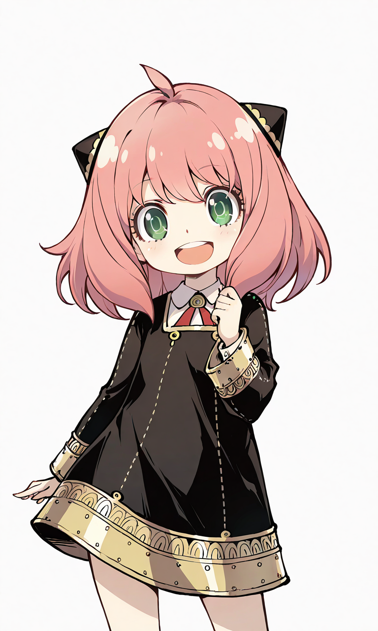1girl, anya forger(spy x family), smile, open mouth, cowboy shot, simple background, white background, masterpiece, high quality, high resolution, tokiame, tokiame