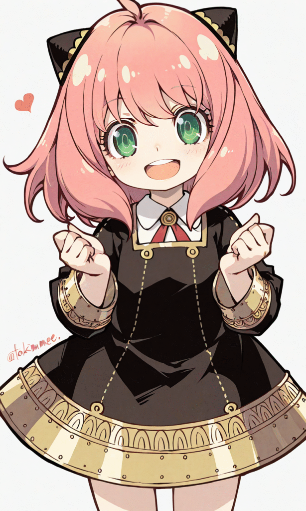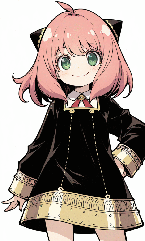 PixAI【Shiitake-Mix】1girl, anya forger(spy x family), smile, hands on own hips, cowboy shot, simple background, white background, masterpiece, high quality, high resolution, tokiame, tokiame